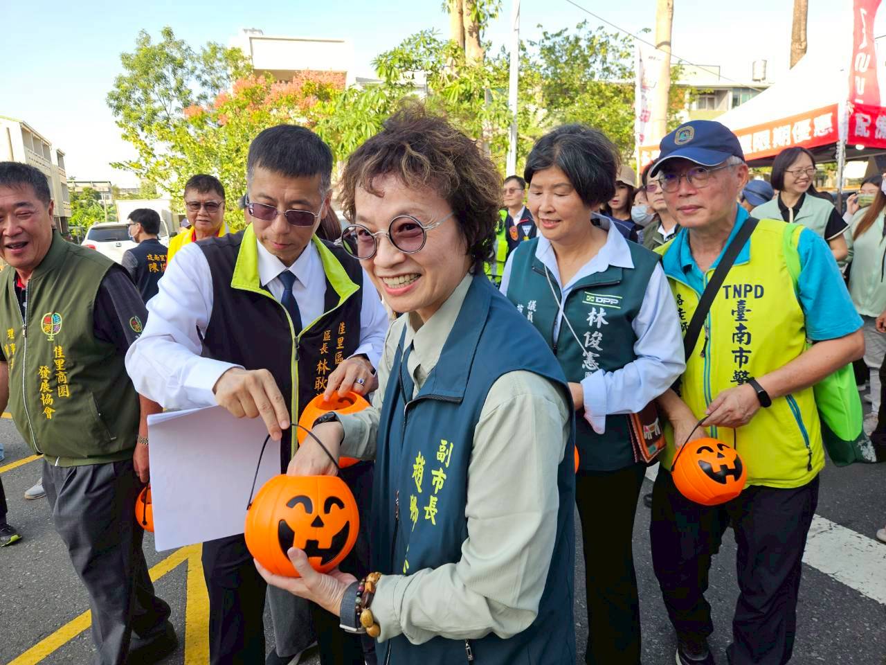 由趙卿惠副市長、立委、議員、區長、商圈理事長及眾位嘉賓手持南瓜桶,在佳興國小舞獅隊帶領下大進場。沿路發送足甜ㄟ糖果,給鄉親體會不一樣的萬聖氛圍!