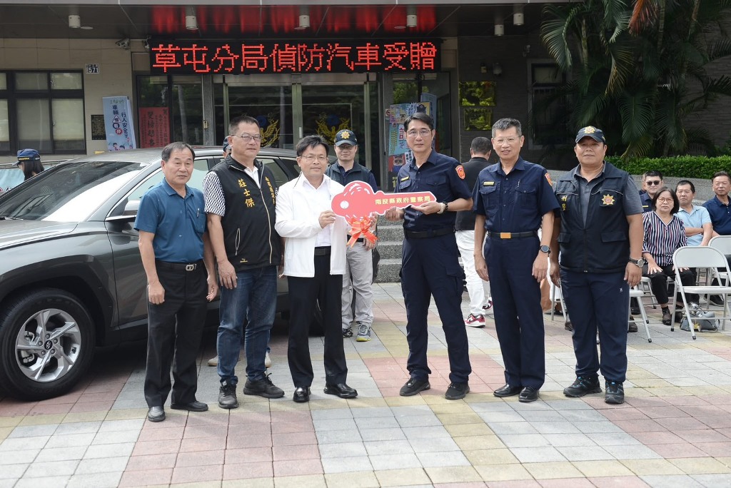 【記者張彥勳/草屯報導】為強化警方治安維護工作,提升警用裝備效能,縣議員莊士傑邀集南投縣商業會等人士,共同出資捐贈偵防車1輛,提供草屯警分局偵查隊使用,27日於分局門口廣場舉行捐贈儀式,由南投縣商業會理事長廖俊哲代表捐贈,草屯分局長劉千祥代表受贈。