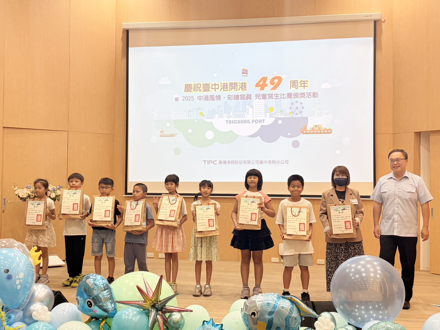 【記者楊川欽台中報導】臺灣港務股份有限公司臺中港務分公司於29日假震大國際會議中心,舉辦「慶祝台中港開港49周年暨2025中港風情.彩繪寫真/兒童寫生比賽頒獎活動」,特邀請港區航港業界代表、政府機關及獲獎學童暨家長們共同歡慶,一同見證臺中港49年來輝煌成就與永續轉型的嶄新面貌。