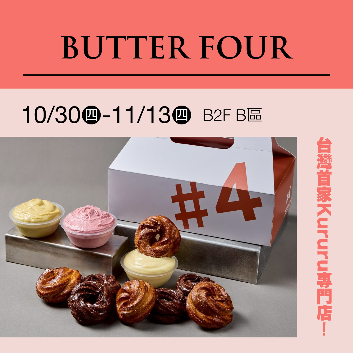 新創甜點岢露圈沒有內餡卻比爆漿還濃郁!長的超像甜甜圈卻是沾著吃的全新吃法!又想吃泡芙又想吃甜甜圈的不用糾結啦!外層焦香、內裡柔軟的雙重享受,台灣首家kururu專門店《BUTTER FOUR》驚喜登場!《經典品牌紅葉蛋糕攜手CREAM CO.鮮奶油有限公司》共同創造鮮奶油派對!美感與品質的雙重保證!帶給大家味覺與視覺的雙重饗宴!不只這些~還有超人氣深夜甜點店《深夜裡的法國手工甜點》、網路熱銷破10萬的《KUKU COCO貝果》以及韓國爆紅的《HART TIRAMISU》敲敲提拉米蘇!最高品質的食材、最有誠意的厚實用料,最精緻的外表!讓你們不只吃得開心還能輕輕鬆鬆拍出高級網美照!獨家甜點快閃店都在台南新天地,快一起來享受吧!