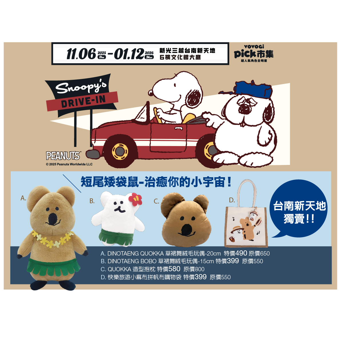 11/06起《YOYOGI PICK 市集超人氣 全明星SNOOPY DRIVEーIN》在台南新天地快閃兩個月,週年慶也有卡友禮的聯名,想收集周邊好物的朋友們一定不能錯過,另外11/15也有和查理布朗、史努比的見面會!機會難得,快來一起同歡吧!