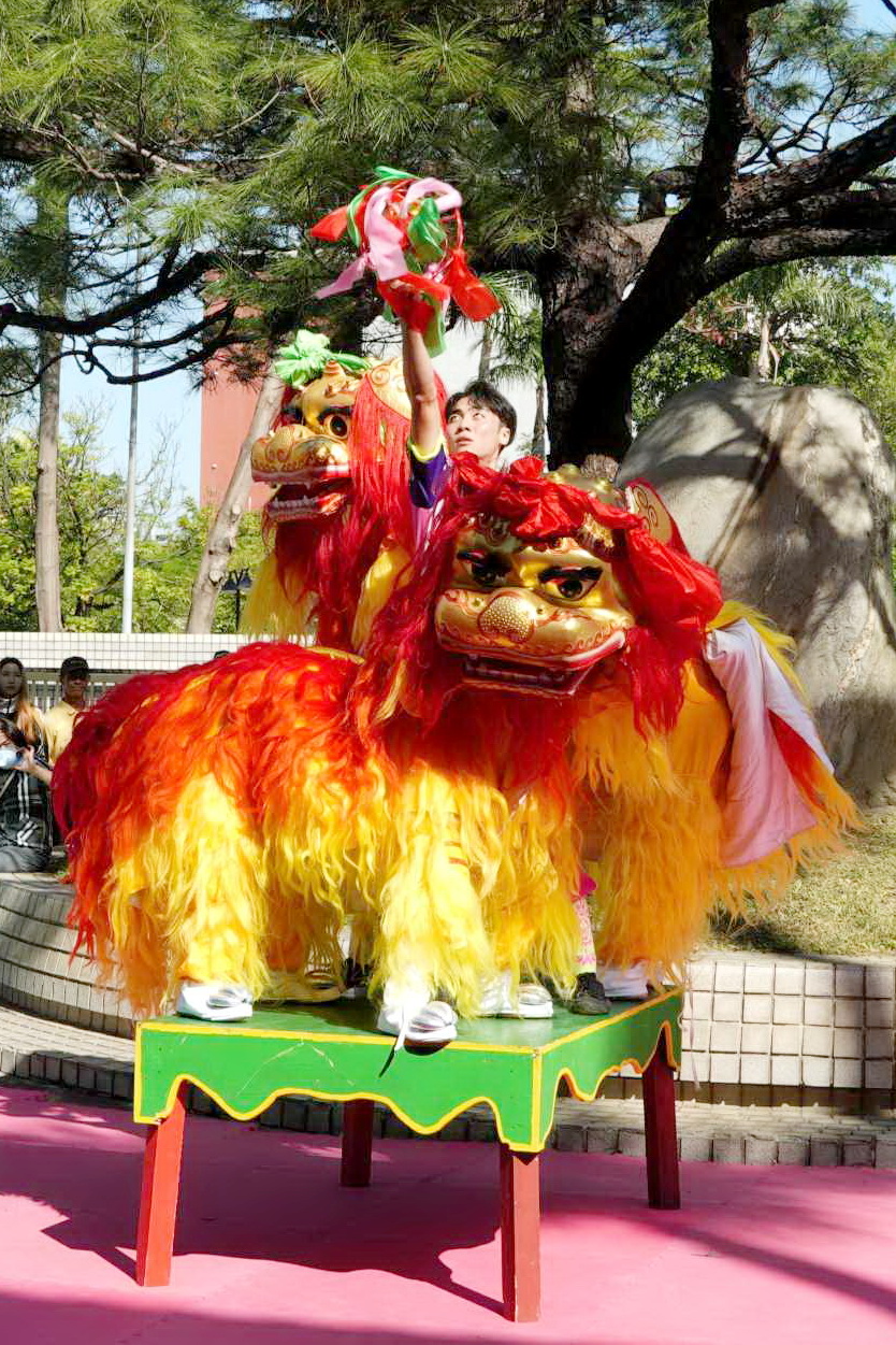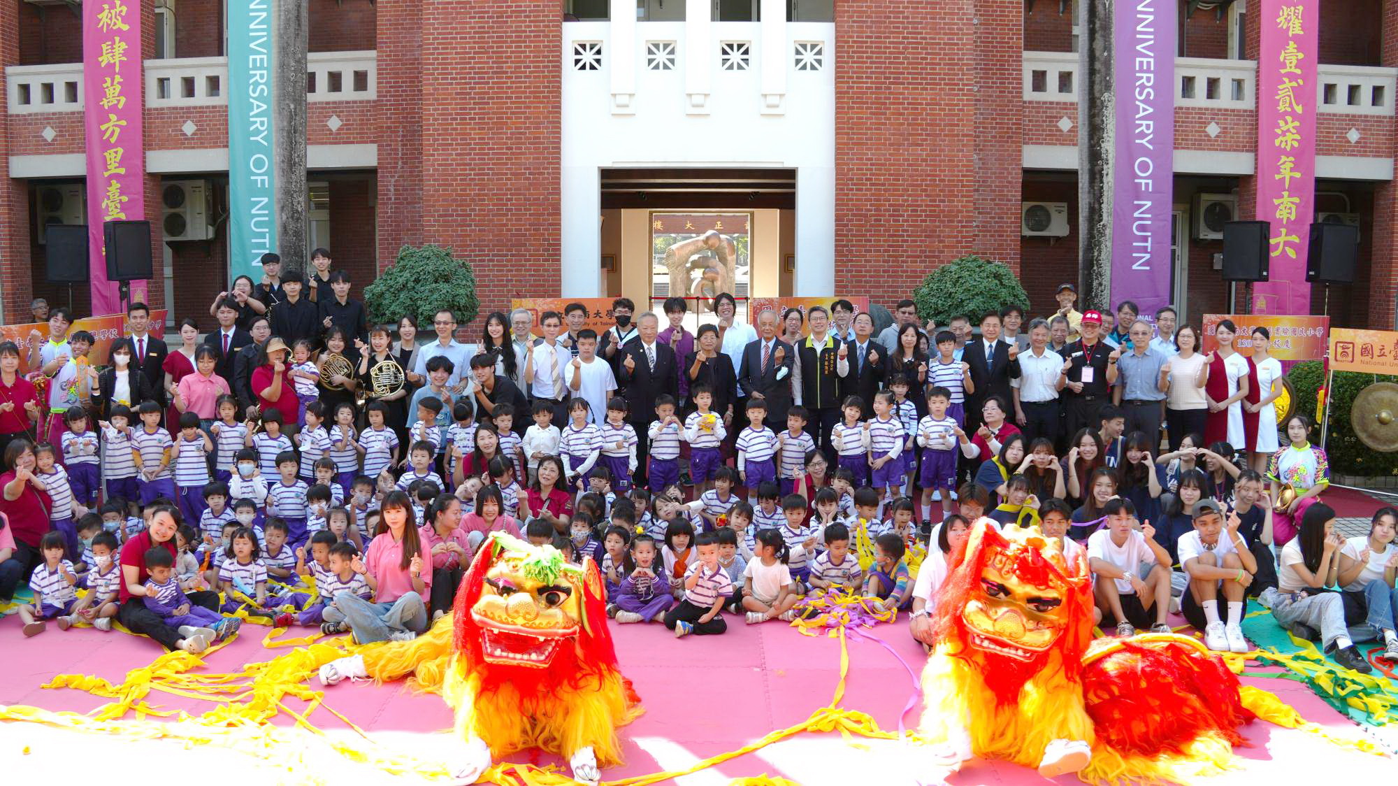 典禮由南大音樂系管樂團演奏揭開序幕,悠揚的樂聲在紅樓前緩緩流動,為現場注入祝福般的歡欣氣息。隨後,南大熱舞社以活力四射的舞蹈登場,瞬間帶動全場氛圍;附小幼兒園的小朋友接續以動感音樂呈現童趣舞蹈,輕快節奏與活潑動作成為典禮中最純真亮眼的畫面。附聰學生緊接帶來《男子漢一匹》與《阿帕次》演出,以歌聲與舞蹈展現自信與團隊精神,傳遞勇氣與熱情。壓軸的南大民俗體育隊以《鼓韻流鈴轉·笑獅慶南大》創意展演登場,融合戰鼓、扯鈴與北獅等多項技藝,以穩健的節奏與俐落的身法展現長年訓練的深厚實力,贏得全場熱烈掌聲。