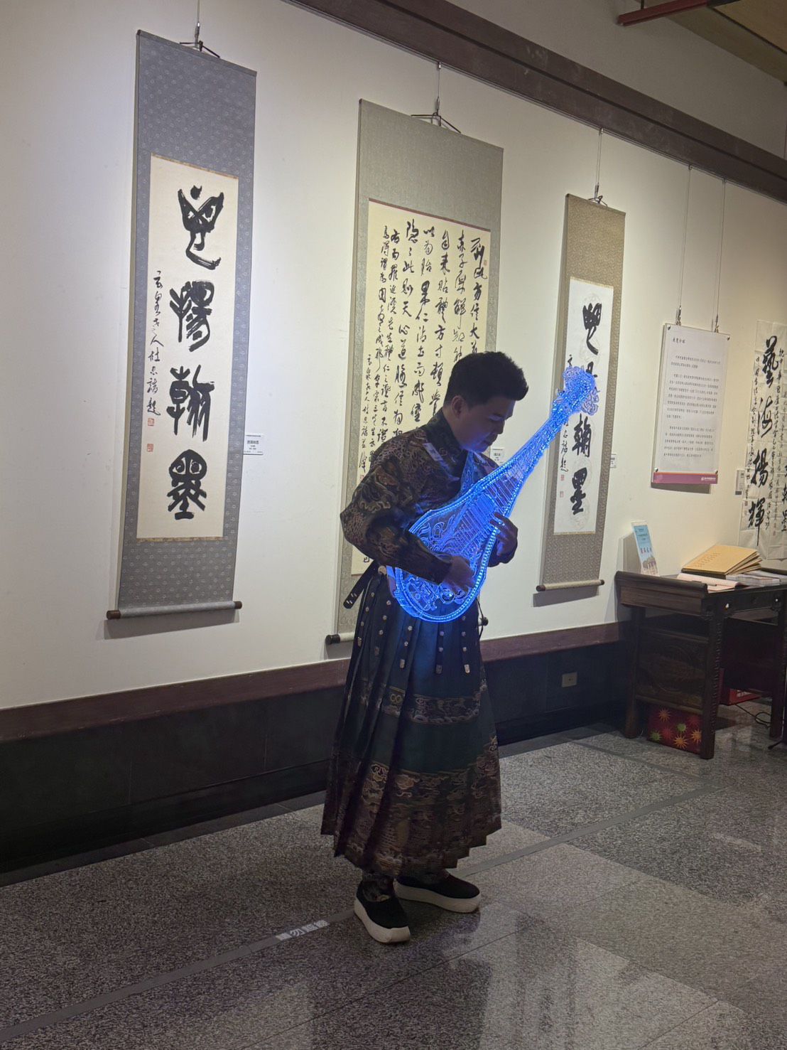 十五日的開幕典禮,司儀由懷古藝術公司總監(即策展人)蔡篤釗、中華鬯爐書法學會秘書長沈致中共同主持,首先由琵琶公子黃俊豪精彩演奏揭開序幕,接著由港區藝術中心秘書周武慶、台灣中國書法學會副理事長張自強、阮威旭、前台中縣文化局長陳志聲等人受邀致詞,稱讚該會對於文化發揚的貢獻;鬯盧書法學會理事長蔡淑惠除了感謝各界的鼎力支持,並表示這是該會首度到港區藝術中心展出,展品都是該會的會員精品值得欣賞,相信到場觀賞的民眾會覺得不虛此行。
