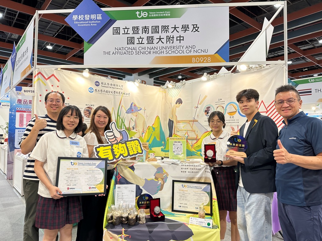 暨大附中感謝母校 國立暨南國際大學教育學院大學社會責任(USR)計畫 的支持與協助。在駱奕帆老師、吳俊誼老師、暨大教育學院陳啓東院長以及山立坊教育團洪晧銘老師的聯手指導下,本校學生以地方產業為核心,成功發明多項具創新性與實用性的作品,並在2025台灣創新技術博覽會 中脫穎而出,一舉榮獲6個獎項,實屬難能可貴!展現學生的創意與研發能量,也突顯大學與高中攜手合作、扎根地方的教育力量。感謝所有投入指導與協助的師長,也恭喜所有獲獎同學,再次為暨大附中寫下亮麗佳績!