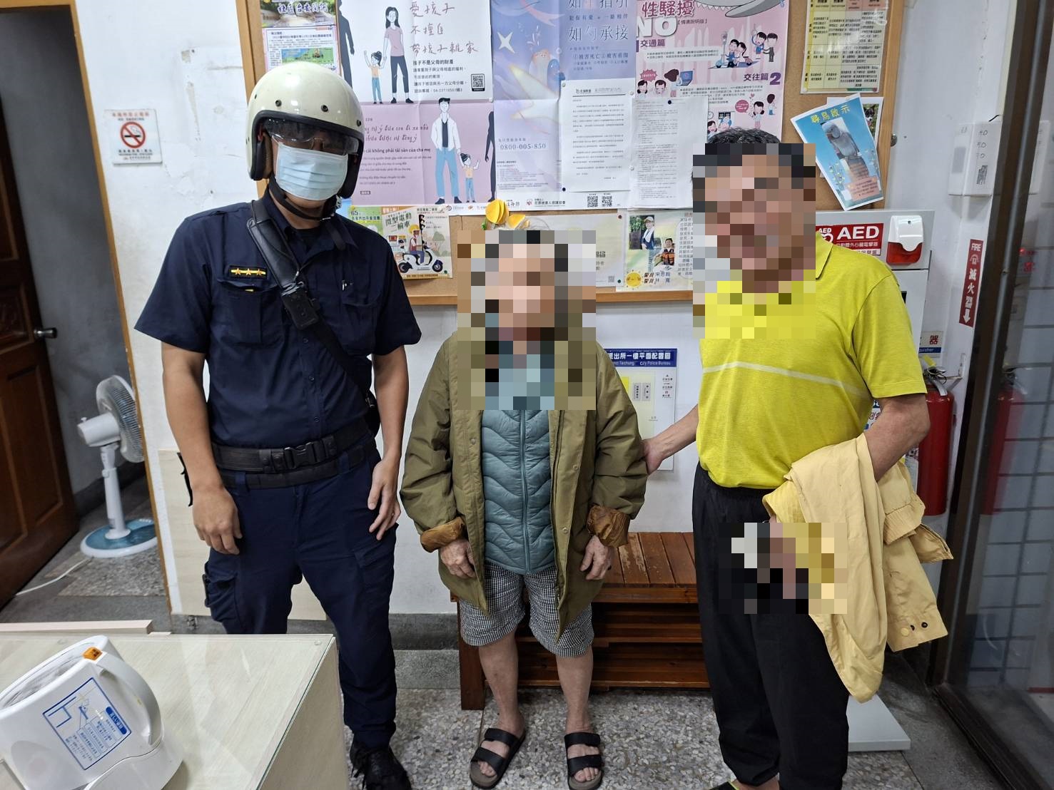 日前下午4時53分許,清水警分局明秀派出所副所長甘致宇、警員黃國展獲報於沙鹿區正英路有1名迷失老人徘徊,疑似找不到回家的路,二名員警立即趕赴現場,發現該名周姓老婦(33年次)無法清楚說出姓名及年藉,僅表示「要出門走走,但出門後感覺地方很陌生,想要回家卻找不到路」,由於當時海線氣溫驟降並有間歇性降雨,婦人僅穿短袖及短褲,身體微微顫抖,警方見老婦衣著單薄,雙手冰冷,擔心淋雨受寒,員警表示「我們幫你找回家路」,趕緊先將婦人載返派出所休息,並提供熱水與暖暖包協助取暖,最後警方比對系統後確認其身分,即通知其兒子陳姓男子報平安,她的兒子隨即趕往派出所,順利將母親接回家。