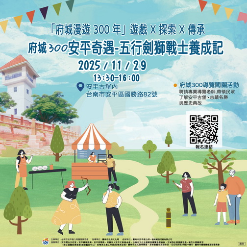 安平魅力商圈發展協會以「府城漫遊300年-遊戲X探索X傳承」為主題,訂於114年11月29日(六)下午13時30分至16時在安平古堡辦理《府城300安平奇遇-五行劍獅戰士養成記》導覽闖關活動。劍獅是安平的守護神,早期劍獅的安置,會以家宅的方位、五行、顏色、風水、數字為元素,進而加強劍獅鎮宅辟邪,保安旺宅的效果。活動以小範圍的走讀,透過專業導覽解說、體驗互動、收集探索的遊戲方式,完成任務,在了解安平文化之餘成長為全方位的劍獅戰士!