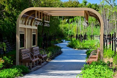圖說:后里泰安周邊景觀設施改善工程-火車造型休憩花架。(觀旅局提供)