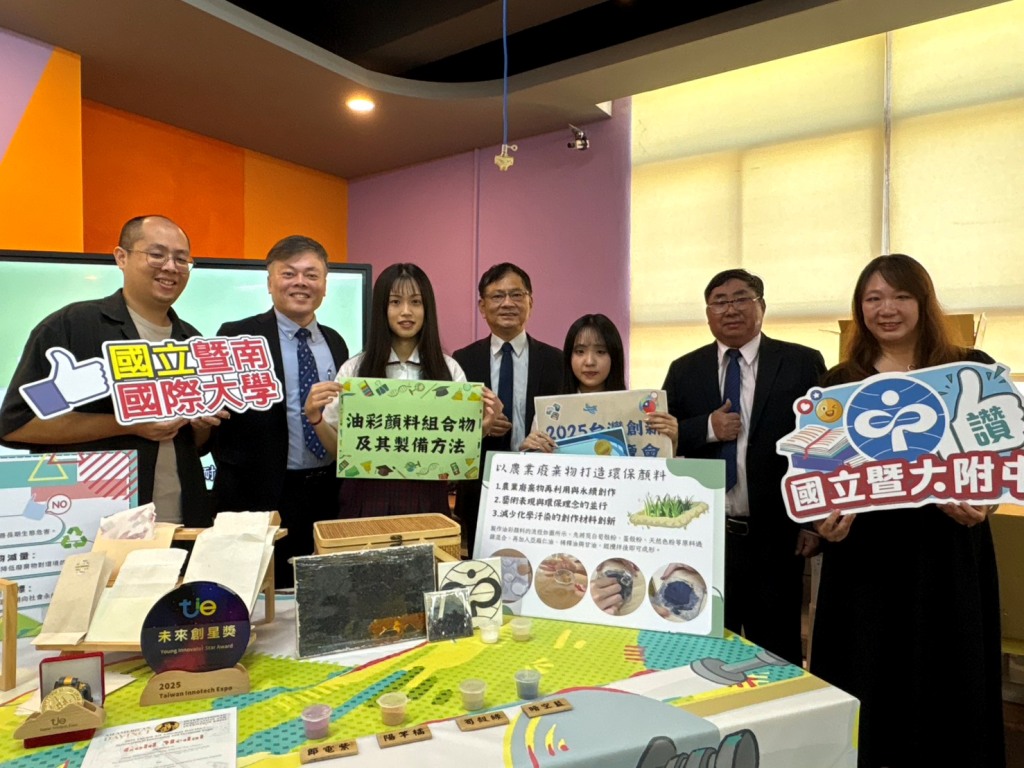 暨大附中學生鄭怡心、張芷芸在駱奕帆老師與洪晧銘老師的指導下,共同研發作品「油彩顏料組合物及其製備方法」。創作靈感源自合歡山的暗黑星空,兩位學生利用原本可能被棄置的筊白筍殼、蛋白殼等材料,加入植物色粉與環保油劑,調製成主色調「暗空藍」。此色澤深邃沉靜,並富含天然顆粒質地,成功呈現夜空的層次與深度。作品並延伸開發「節電紫」、「筍殼綠」、「陽竿橘」等顏料,以描繪山影、星光與自然交融的畫面。