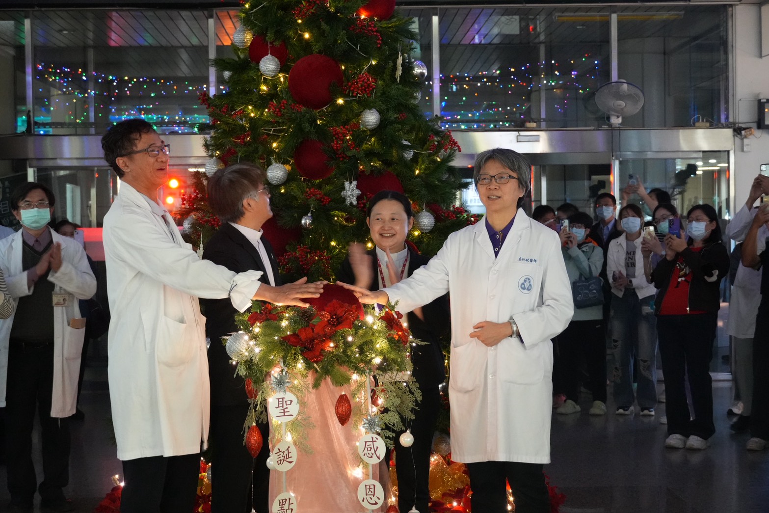 隨著眾人的倒數聲,由台南院區宋信喜董事長與劉啓擧院長,麻豆院區陳淳佳董事與唐秋敏副院長同步按下啟動鈕,兩院的聖誕樹與周邊燈飾同步亮起,金色的燈光與裝飾瞬間將院區點綴得美輪美奐,為即將到來的聖誕佳節揭開序幕。