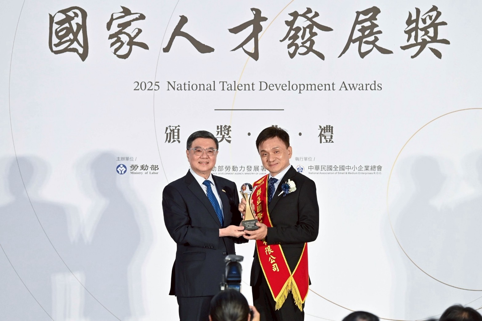 上圖:群亞國際奪國家人才發展獎,由行政院長卓榮泰頒獎,群亞總經理郭一慶(右)代表領獎。