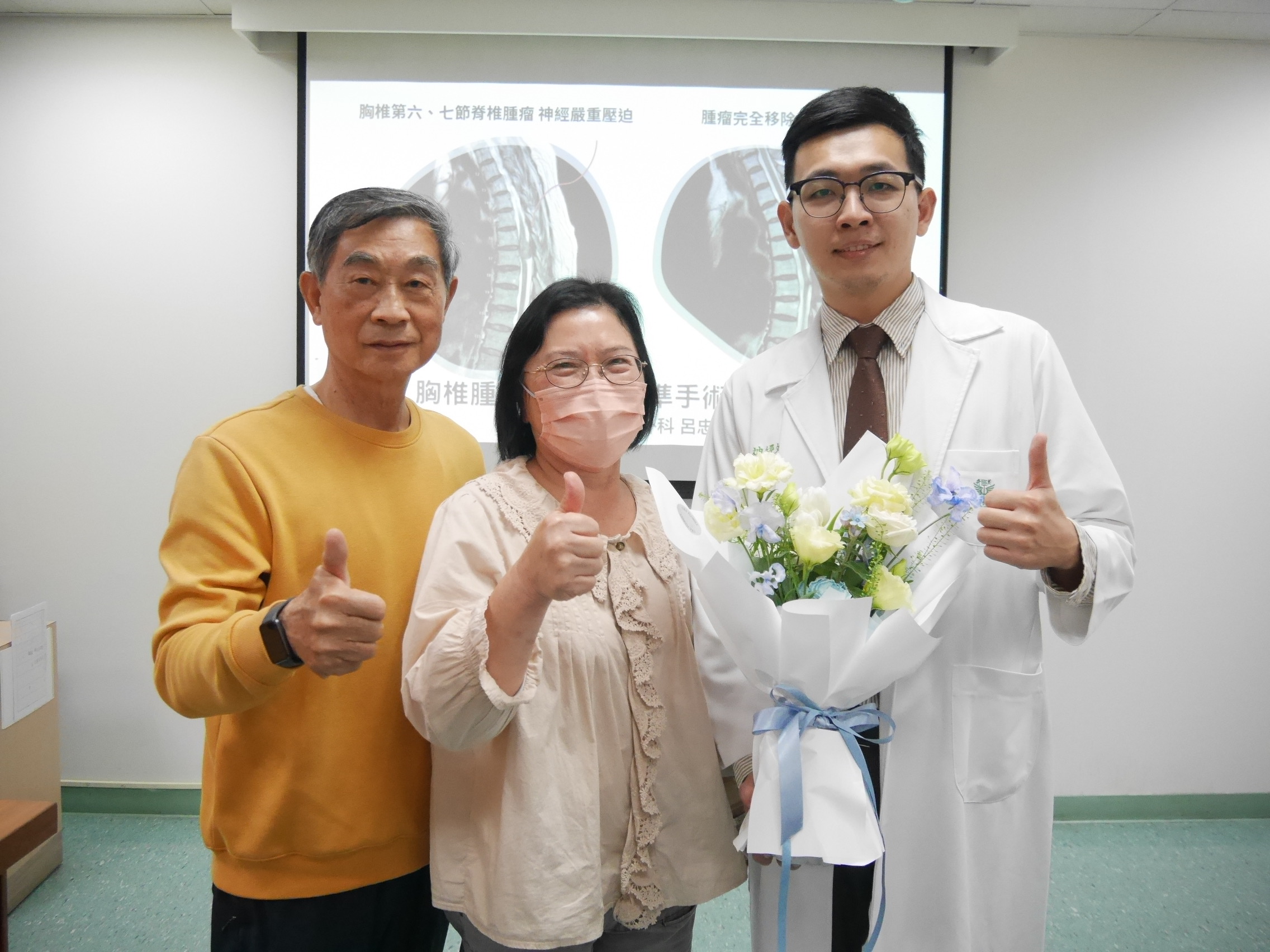 王姓婦人在就醫時,雙腳已完全喪失力量。醫療團隊立即啟動脊椎腫瘤緊急處置流程,進行脊髓減壓手術、腫瘤切除與病理確認,以及脊椎內固定重建。經過手術與復健團隊半年密集訓練後,病人從完全癱瘓,到可以扶著助行器,再到擺脫輔具重新站起來,最後親自走進門診複診。呂醫師說,手術的目標是「搶時間救脊髓」,脊髓一旦壓迫太久即可能造成永久損傷,因此越早減壓,恢復機率越高。此次病人罹患的是良性腦膜瘤,屬於慢性生長型腫瘤,在不知不覺中逐漸壓迫脊髓,所幸此類腫瘤若能完整切除,復發機率低,預後通常良好。所以當病人可以再度行走,踏進診間的那一刻,我們所有人都很感動。