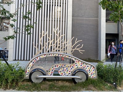 葉局長還指出海線小驚喜,沙鹿沙田立體停車場兩輛藝術車款超吸睛,藝術家郭國相創作「樂遊」,以不鏽鋼與馬賽克拼出繽紛車體,車旁還有座椅讓人休憩聊天,藏著沙鹿先民拓荒的故事,民眾停好車別急著走,這裡不只是停車點,更是城市記憶的園地;而北屯舊社站停車場公共藝術「停車、MRT遇見ART」,靈感來自交通錐撐起的圓形意象,象徵捷運與台鐵的完美銜接。
