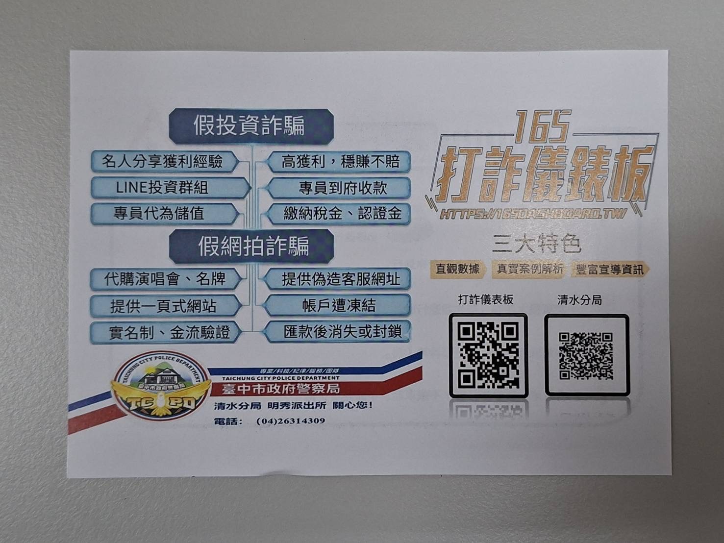 據警政署165打詐儀錶板統計114年11月受理詐騙件數1萬3559件,詐騙案類前3名為網路購物、假投資、假交友(投資詐騙)詐騙,為提醒民眾防詐識詐觀念,台中市清水警分局宣導防詐觀念,無所不用其極,宣導方式亦是五花八門,無孔不入,除了製作梗圖分享臉書網頁、line群組,更是分不同年齡組群,如分局長帶隊前往市場掃街防詐、各區長者活動據點,公司(工廠)行號及移工、各級學校學生及家長等等加強防詐宣導。