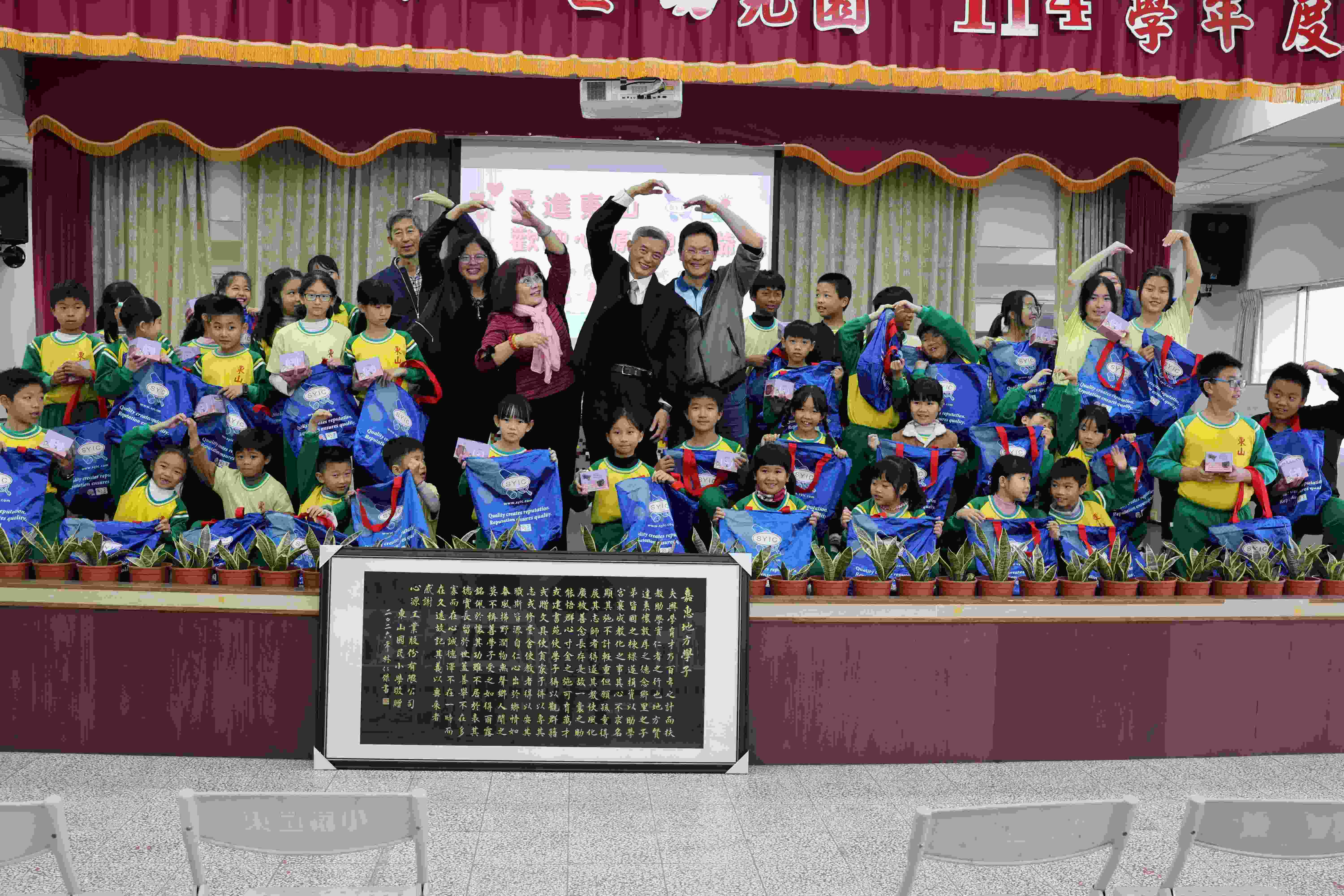 活動中,心源公司致贈學校「諸葛四郎」多語文動漫光碟,以及贈送每位小朋友星座馬克杯、環保收納購物袋、金邊虎尾蘭與清水散步文創品,透過文化素材引導孩子學習忠孝節義及環保與在地情感;學校也回贈林仁傑主任書法墨寶〈嘉惠地方學子〉及東山國小社團服,表達誠摯感謝。