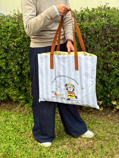 消防局長孫福佑表示,這款多功能防災提袋源自消防局同仁的創意發想,透過可愛活潑的圖像設計,將原本生硬的防災知識轉化為親子都能接受的生活教材,歷經多次與廠商溝通討論,最終完成兼具實用性與台中市特色的防災宣導品,未來消防局也將持續推出更多生活化、防災化的宣導品,讓市民在日常中自然學習防災,落實「自助、互助」的防災精神,共同打造更安全、宜居的城市。