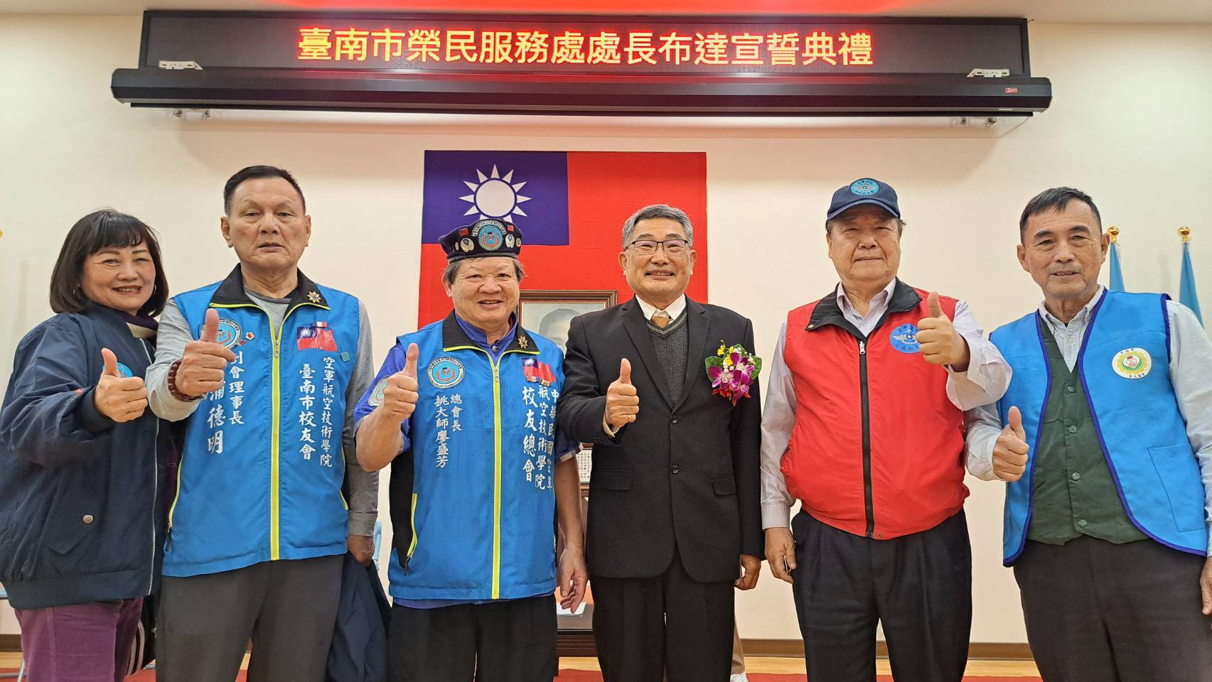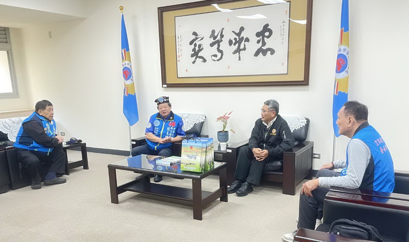 (記者邱秋逢/台南報導)空軍航空技術學院校友總會,總會長廖盛芳率台南市空軍航空技術學院校友會理事長蒲德明、台南市退伍軍人協會理事長衡志明,臺南市韓友理事長熊溶溶,連袂於布達前,拜會胡思湘處長,同時贈送退輔會補助,校友總會出版的〔空軍地勤榮民生命史〕五本新書當賀禮,祝賀走馬上任,馬年馬上發,搶頭香,成了第一批賀客,處長隨即回贈了退輔會福壽山茗茶。