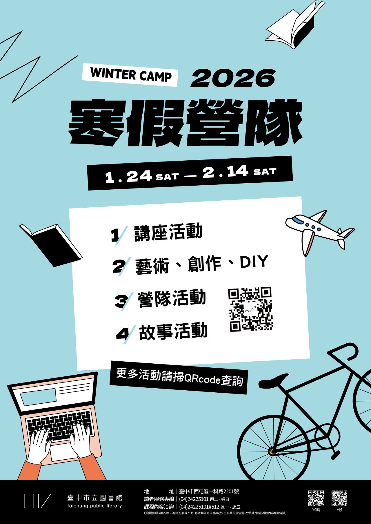 不只總館精彩,各分館同樣熱鬧登場,太平坪林分館推出「數學武林秘笈」、「冬季藝術營」、「蒙式五感教育」及「飛行工程營」,讓學習變成動手實作的趣味挑戰;烏日分館攜手自行車文化探索館舉辦「單車小集錦-實用騎行技巧大公開」,帶孩子認識正確騎乘與安全觀念,以及插畫家愚魚老師的手提袋創意彩繪;精武圖書館的毛根藝術創作;石岡分館的多元手作課程等,內容豐富,適合大小朋友一起來參與。