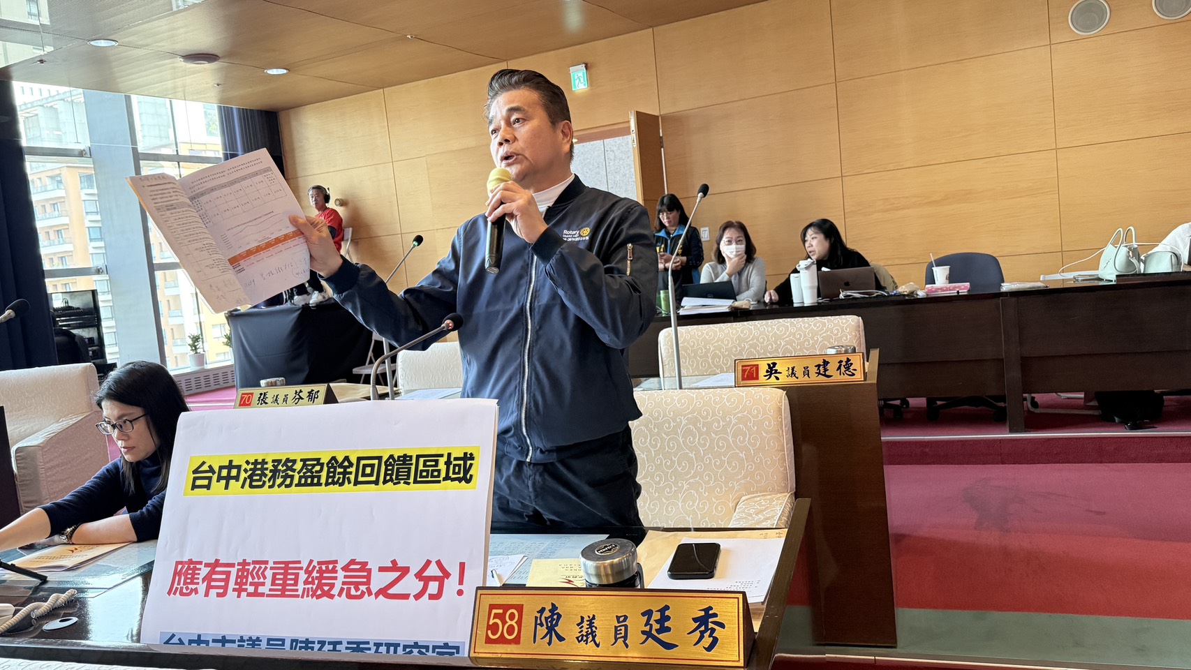 【記者楊川欽台中報導】台中市無黨籍議員陳廷秀質詢,關於「台中港務公司盈餘回饋金專款專用」專案報告議題,談到當初提出此專案議題於此次臨時會中做專案報告,首先肯定中市府相關局處,尤其建設局養工處報告中也提列了108-115年經費相關及補助資料,但視察了115年度預算編列情形,發覺幾乎所有的補助都坐在龍井,不然就是大肚區。