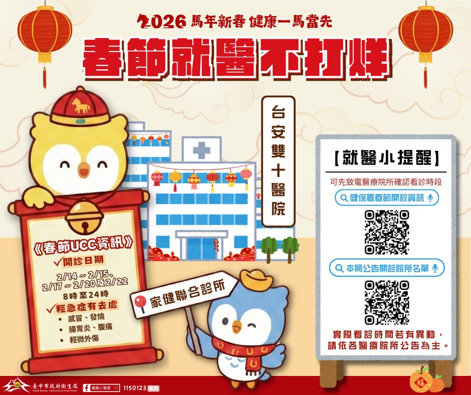 衛生局表示,春節期間常見感冒、腸胃炎、發燒及輕微外傷等輕急症就醫需求增加,為分流急診人潮、確保急重症患者即時獲得照護,台中市設有2處假日輕急症中心(Urgent Care Center, UCC)─台安雙十醫院及家健聯合診所,於春節期間(2月14日至15日、2月17日至20日及2月22日)持續提供門診服務,讓輕急症民眾就近就醫。