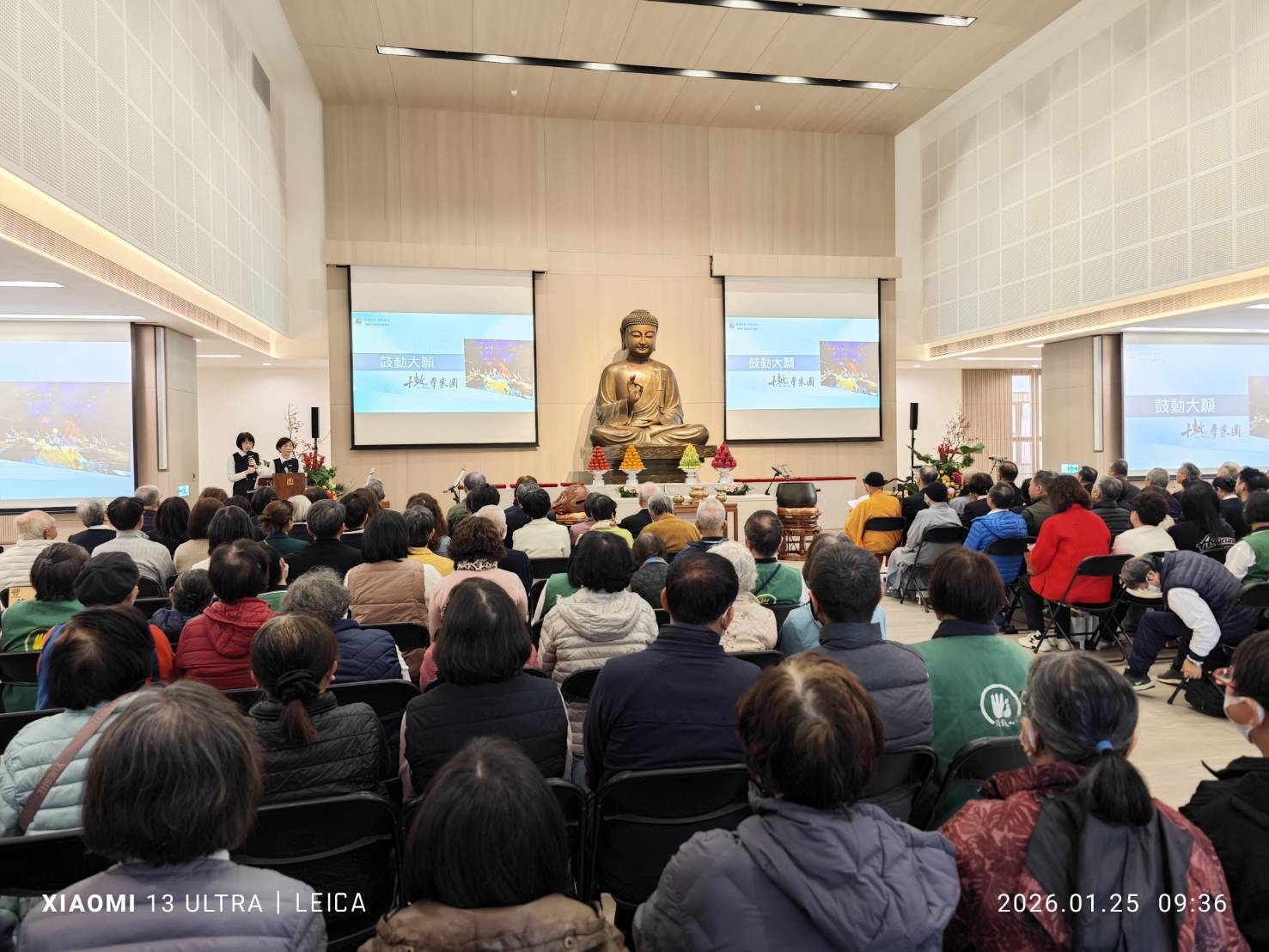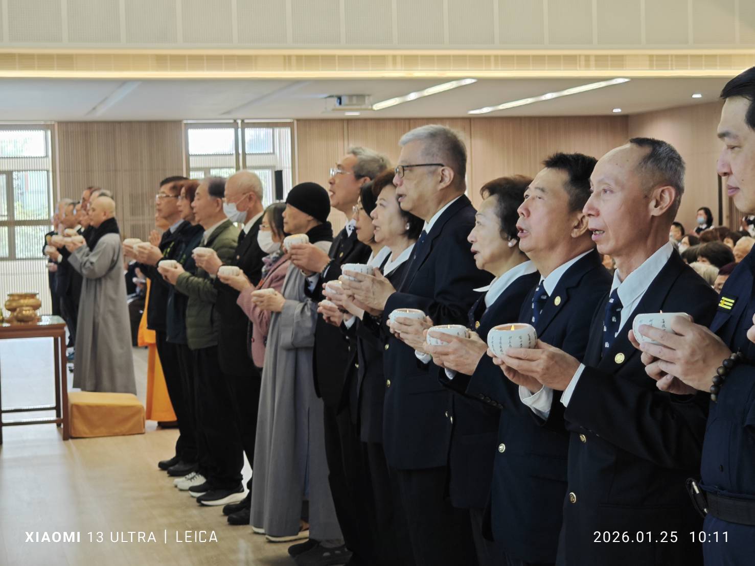 同日下午2點起,雲集寺也在大殿舉行2026年法鼓山首場祈福皈依大典。在觀音菩薩聖號中,方丈和尚帶領僧團同為256名新皈依佛門弟子祝福,並掛戴結緣佛牌,以《正信的佛教》等書籍,勉勵信眾以正信佛法安身立命。場面莊嚴殊勝,皈依信眾與上百名的觀禮親友法喜洋溢。
