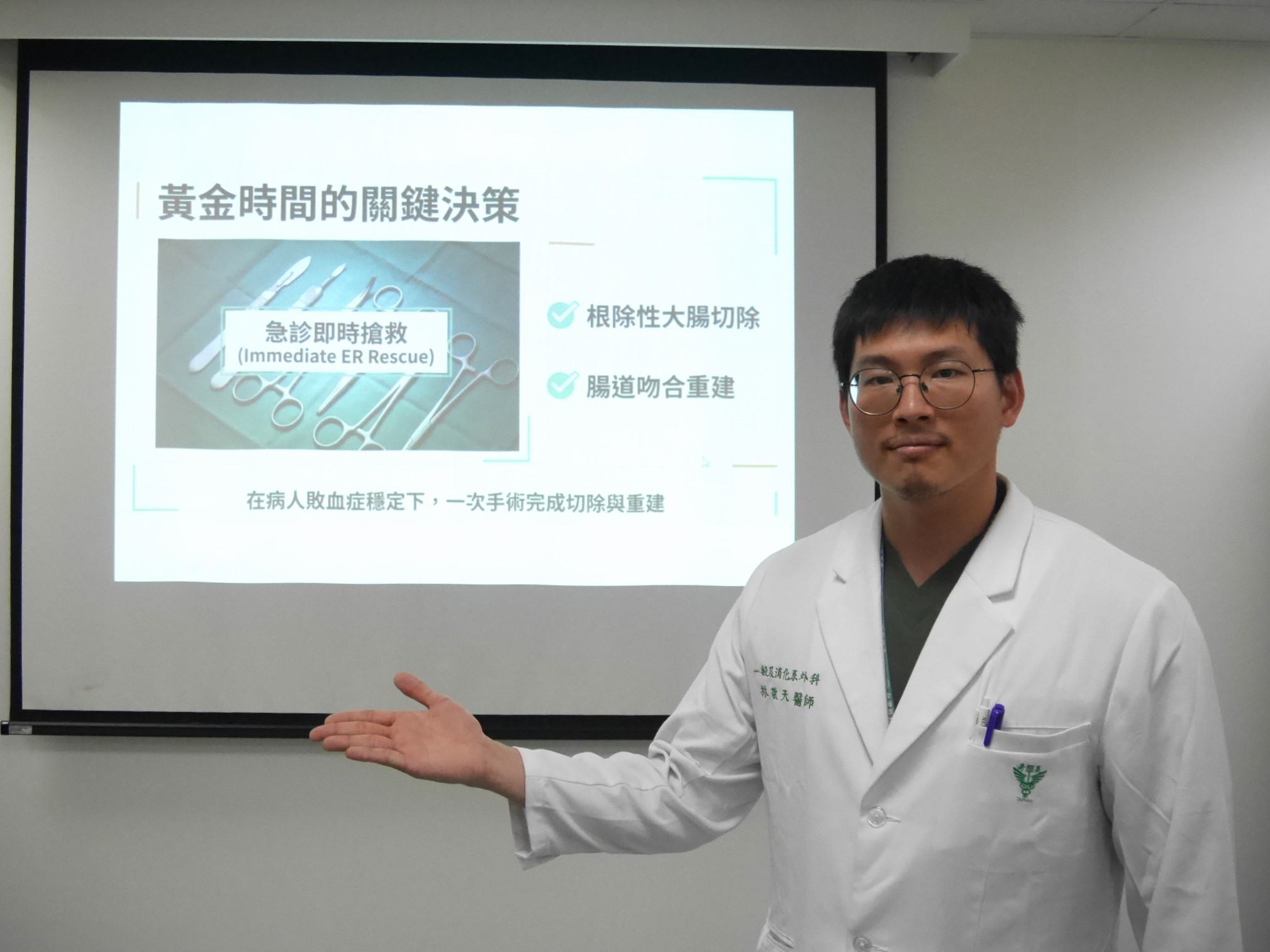 (記者邱秋逢/台南報導)52歲梁先生,平時身體健康行動自如,去年中發現有血便後隨即至診所就診,經糞便潛血檢查呈現陽性反應,便進一步安排大腸鏡檢查,結果發現是大腸腫瘤且造成腸道阻塞,在等候病理切片報告期間突然發生劇烈腹痛,緊急至急診就醫確認是腫瘤造成腸穿孔,醫療團隊及時於黃金時間施予手術完成根除性大腸切除及腸道吻合,並搭配術後加速康復療程(ERAS),梁先生於術後第2天便開始正常飲食且配合手術復健計畫,順利在一周後出院,後續接受一系列的全身性治療及追蹤。