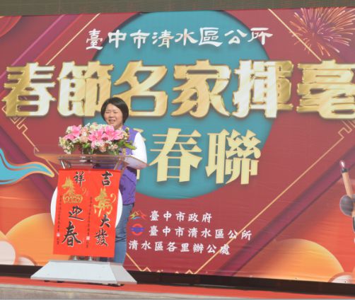 清水區公所的這項「春節名家揮毫贈春聯活動」,於上午在區公所前熱鬧舉辦,開場前先安排歌舞表演助興,區長蔡慶生在致詞時表示,每年舉辦這項活動時都受到地區民眾的高度肯定,因此持續舉辦讓大家都能拿到書法家揮毫的名貴春聯;接著是活動召集人名書法家蔡篤釗表示,今年受邀到場揮毫的書法家是來自新北市、彰化縣、苗栗縣及台中市等各地,分屬各書法協會的名家、老師、教授等,實在是前所未見的名師大集合,要讓地區民眾見識到各名師的揮毫功力。
