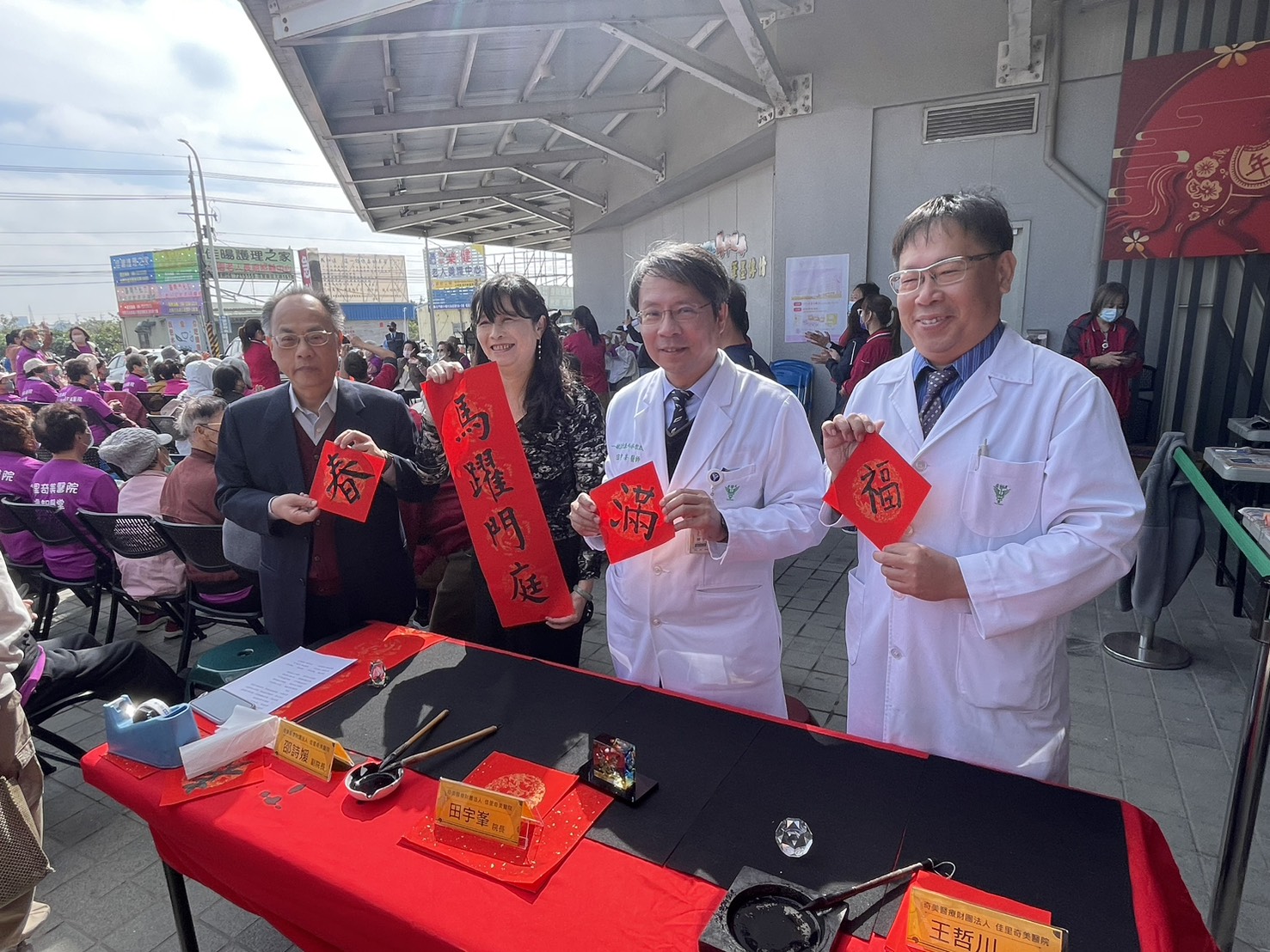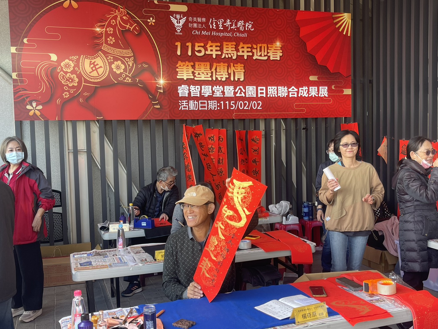 佳里奇美醫院黃玉惠督導說明,本次展覽以「迎春」為主題,融合書法揮毫、春聯剪紙、創意年畫與長輩手作等元素,邀請書法與剪紙藝術家陳啟辰、林幸資、李雯娣、楊奇原、郭美枝、陳瑞祥、林舜乾、謝美鈴老師及劉秀紋老師於現場揮毫創作,將吉祥意象融入社區。長者以春節吊飾、彩繪作品及各式巧思手作呈現一整年的學習成果與生命色彩。現場更有中正大學盧弘毅教授帶領的三味曲團隊音樂老師於現場串場演出。同時安排「家庭照顧者表揚」儀式,向長期以愛與耐心陪伴家人的照顧者致上最誠摯的敬意,感謝他們在長照體系中默默付出的力量,讓社區充滿溫情與感恩。