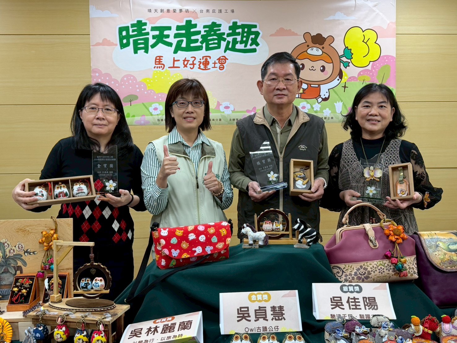 推廣春節活動之外,勞工局鼓勵晴天坊夥伴持續精進創作靈感,局長王鑫基也在記者會表揚「2025晴藝獎-手創藝品競賽」前三名得獎者。金質獎-吳貞慧《Owl古蹟公仔》,作品以象徵智慧與平安的貓頭鷹結合臺南著名古蹟景點熱蘭遮城、孔廟、赤崁樓,展現濃厚的臺南在地特色,收藏及送禮兩得宜;銀質獎-吳佳陽《馳遠千里·駿躍本壘》,以寓意力量與精準的馬連結棒球純粹、專注的精神,並將馬尾巧妙設計為捲尺,形塑成具觀賞兼實用的物件﹔銅質獎-吳林麗蘭《以蘭為行·以旅為詩》,高潔、堅韌與內斂的蘭花融入於旅行吊牌設計,願旅人在奔波的旅途中能帶一份典雅與力量,傳遞「旅行即生活美學」的理念。夥伴們細膩且富含創意的文創商品,不僅造型雅緻,在生活上也具實用性,鼓勵各界採購送禮或自用。