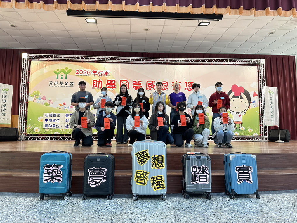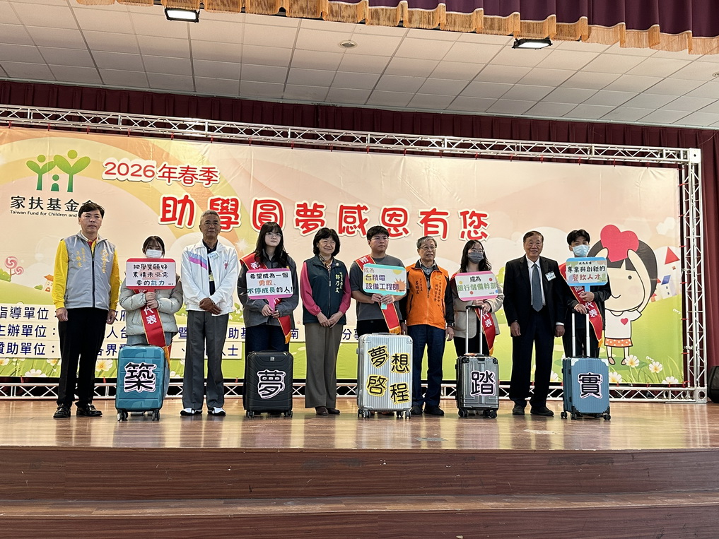 (記者邱秋逢/台南報導)北台南家扶13日於佳里區六里聯合活動中心頒發2026年春季「助學圓夢‧感恩有您」獎助學金,共計216位大專和高中職學生獲頒607萬元獎助學金,3月預計頒發450名國中小學生約120萬元,總計約666名兒少受惠。築夢兒少楊銘軒分享學習成長及勇敢追夢的生命故事,與會嘉賓北台南家扶主委呂明憲、臺南市政府社會局局長郭乃文、開基玉皇宮監查委員王勝慶、台灣冷鏈協會榮譽理事長程東和、弘開善德會理事林耕嘉、助學人卓水林等合力以「勇敢追夢,無所畏懼」、「家扶是你的後盾」、「不忘初心、砥礪前行」、「築夢踏實」、「學海無涯,勇敢探索」祝福勉勵受獎助學讓夢想啟程!