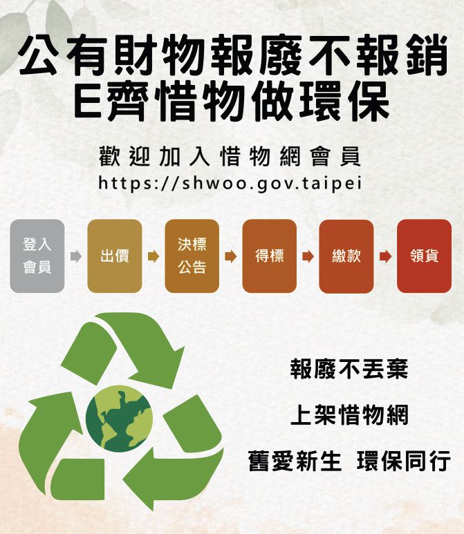 財政局指出,透過網路拍賣機制,不僅增加市庫收入,也延長設備與器材使用年限,減少廢棄物產生,落實循環經濟與環保理念,惜物網已成為公部門與市民共同參與資源再利用的重要平台,歡迎民眾踴躍加入會員、善加利用拍賣服務,一同為永續發展盡一份心力,惜物網網址:https://shwoo.gov.taipei。