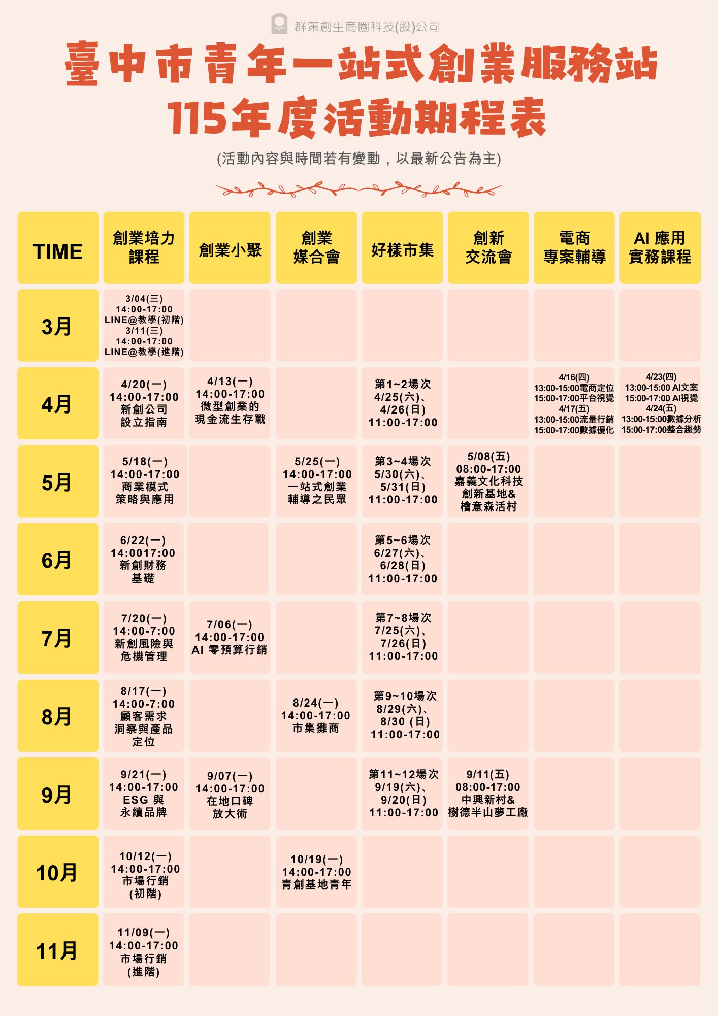 圖說:115期程表-台中市青年一站式創業服務站。(勞工局提供)