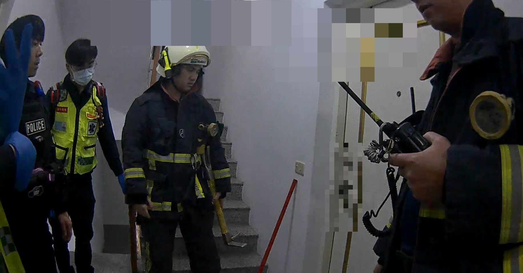 圖說:警方及消防人員在門外設法安撫、救援男子。(警方提供)