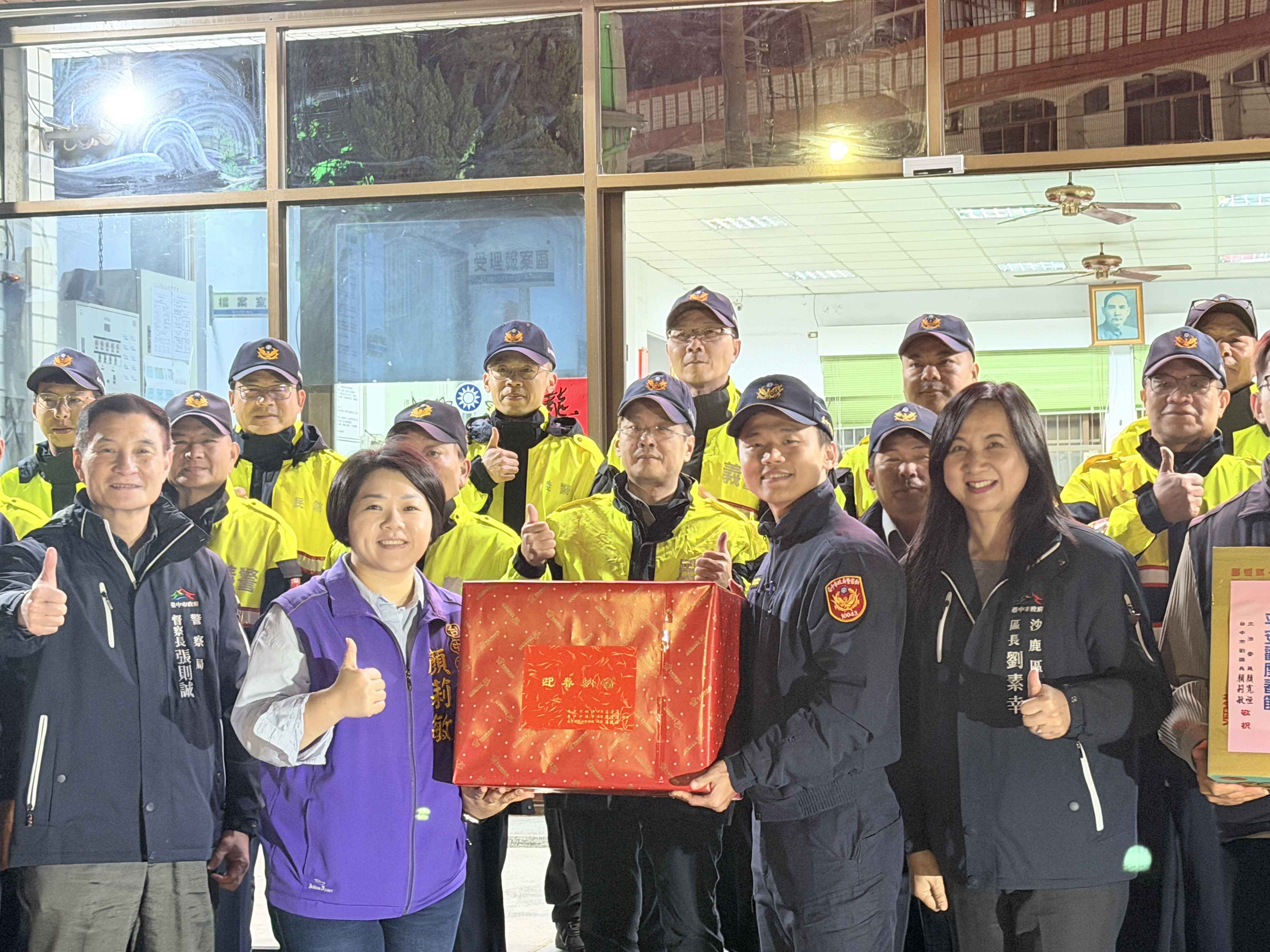議長張清照親自出席,偕同台中市警察局主任秘書張義昌前往清水警分局慰勞,並陸續走訪南社里守望相助隊、清水消防分隊及清水警分局大秀派出所等基層單位,為堅守崗位的同仁加油打氣,副議長顏莉敏亦率同警察局督察長張則誠走訪明秀派出所及沙鹿、清泉地區多處派出所、消防分隊與守望相助隊,慰勞行程緊湊而溫馨,慰勞過程中,議長與副議長皆逐一向同仁致意,感謝大家在萬家團圓的時刻,仍24小時不打烊,守護治安與交通安全。現場並有義警、民防、義交幹部共同參與,展現警民合作、齊心守護海線的堅實力量。