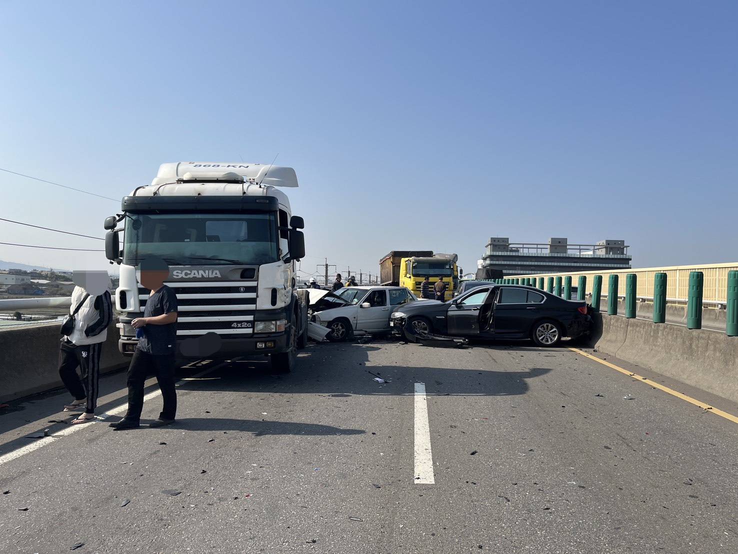 本案發生於14日上午8時51分許,在台61線西濱快速道路北上155.7公里處,吳姓男子(83年次)駕駛自用小客車,由外側車道向左變換車道時,先與前方外側車道由何姓男子(49年次)駕駛的自用小客車發生碰撞後,導致何姓男子的車輛再往前撞擊由姚姓男子(69年次)所駕駛之營業曳引車,現場造成2人受傷,但意識均清楚且無生命危險,駕駛均經酒測後都無酒駕情事,案將依規定製成相關資料,移請交通警察大隊分析研判肇事原因及責任。
