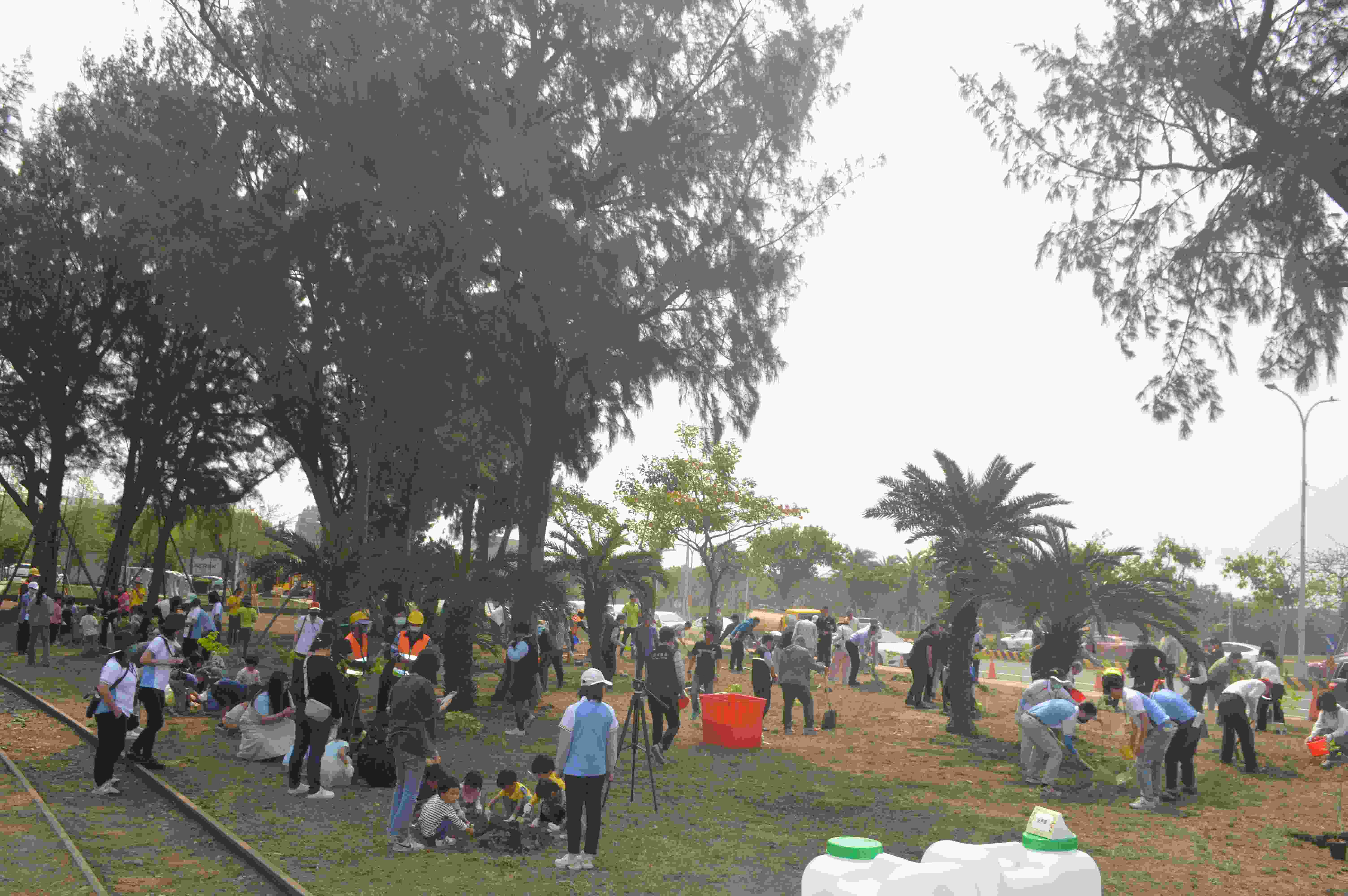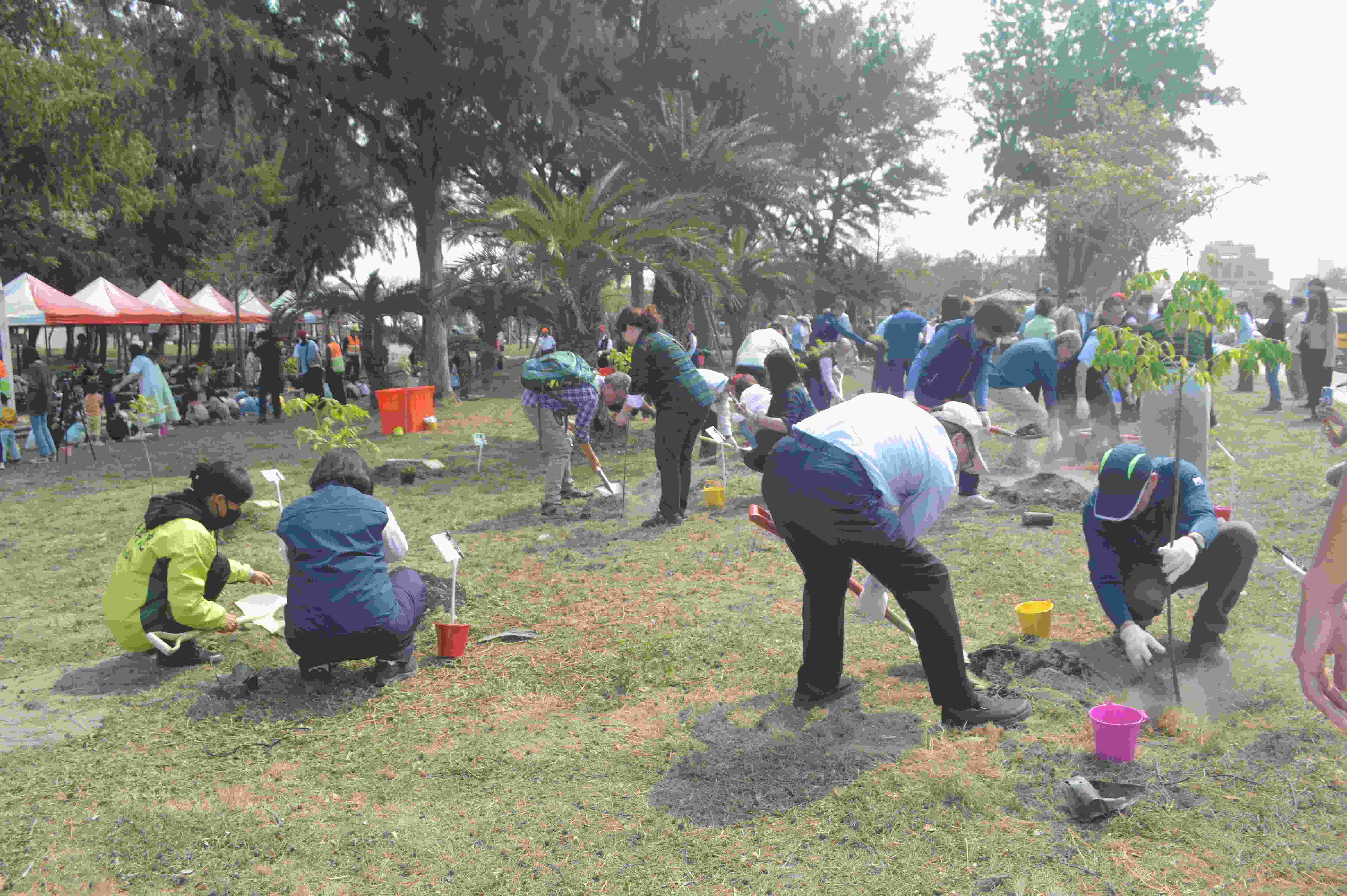 圖二:大人、孩童分排種下樹苗。