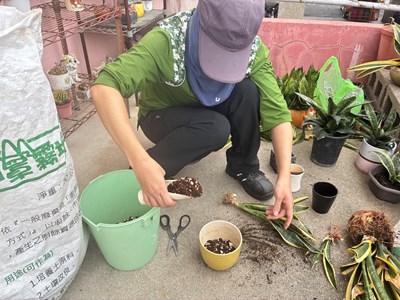 圖說:中西區清潔隊將回收之廢棄盆栽、陶瓷容器等資材進行分類整理,並搭配阿罩霧培養土種。(環保局提供)