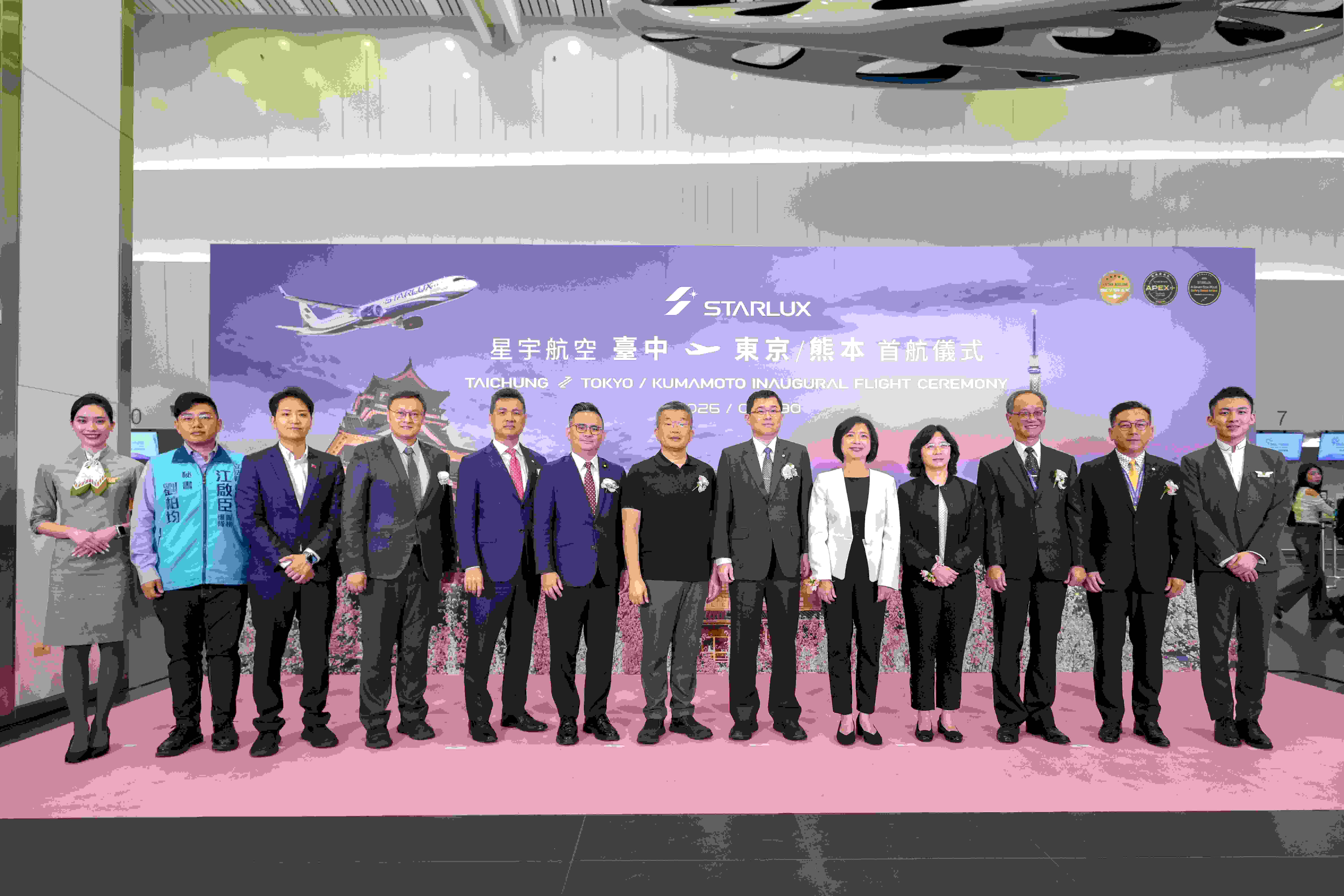 【記者楊川欽台中報導】星宇航空積極拓展中台灣航網布局,於30日及31日接力開航東京、熊本航線,串聯日本重要城市,為中部旅客提供更多元且便利的直飛選擇,今日在東京首航航班JX314出發前,星宇航空於台中國際機場出境大廳舉行盛大的剪綵儀式,由星宇航空張國煒董事長、翟健華執行長主持,並邀請到民航局何淑萍局長、立法委員蔡其昌、何欣純、黃健豪及台中市副市長鄭照新、台中航空站主任張瑞澍等人共同剪綵,見證星宇航空與台中機場的重要里程碑。 星宇航空翟健華執行長表示,星宇航空一直以來將台中機場視為第二營運基地,今日除了迎來兩條新航線的首航,未來將持續強化在中部市場的營運能量,日本一直是台灣旅客最喜愛的旅遊目的地之一,東京跟熊本更是台日商務往來的重要門戶,未來也期待透過持續開闢航線,吸引更多日本旅客造訪台中,帶領旅客深入探索中台灣豐富的人文與自然魅力,促進兩地的交流。