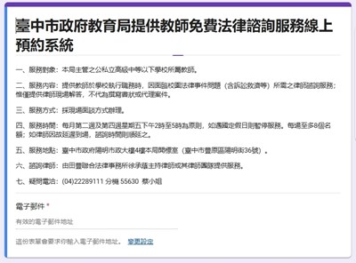 教育局表示,教師免費法律諮詢服務全面採行網路預約制度,並於每月1日上午10時開放當月名額登記,現場面談諮詢服務時間定於每月第二、四週的週五下午2時至5時,此外為了讓更多老師受惠,每人每次諮詢時間以20分鐘為限,地點設於台中市政府陽明市政大樓4樓教育局開標室(網路預約網址:https://reurl.cc/N2RA1e)。