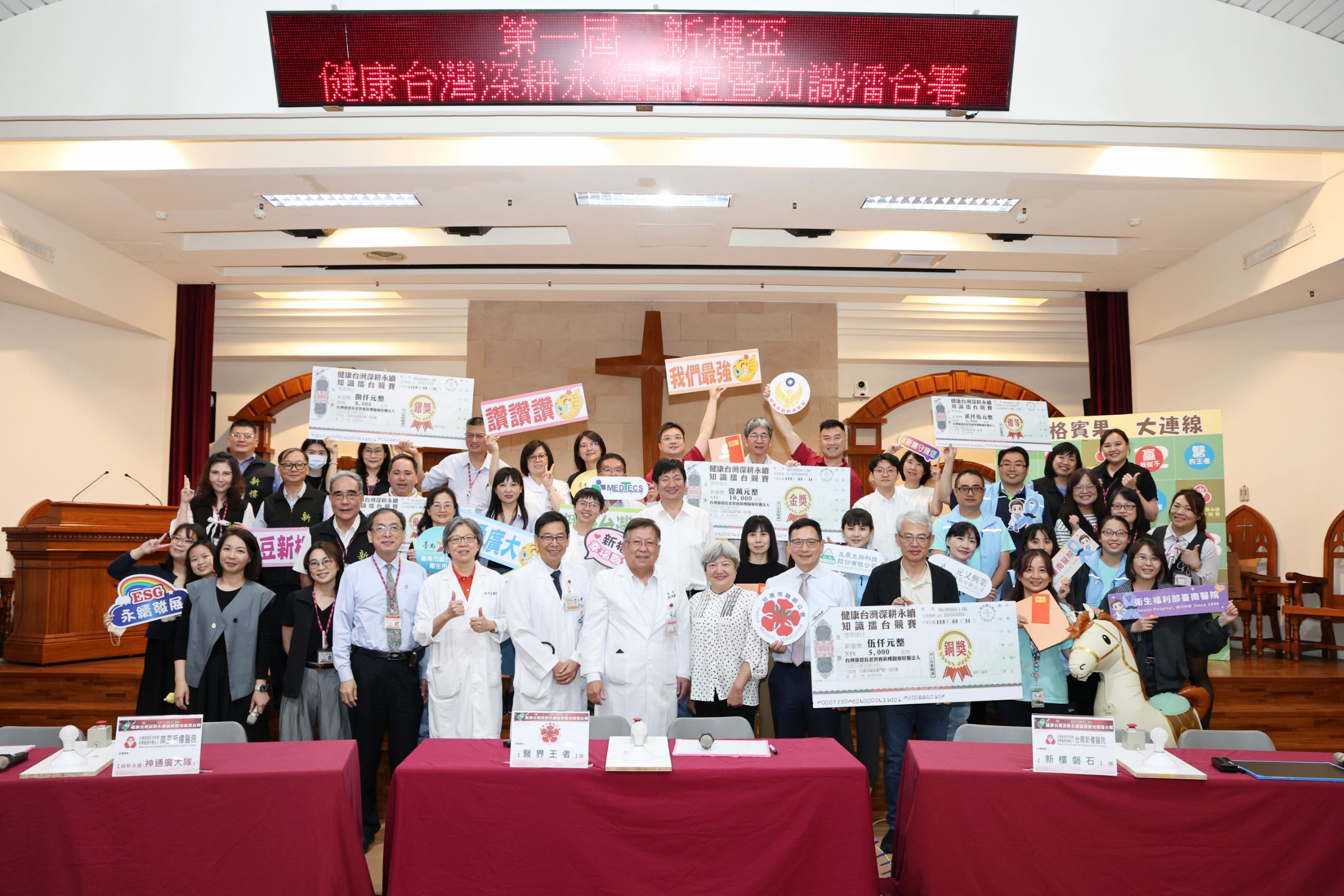 新樓醫院劉啓擧院長提及,以身作則,邁向永續未來,「醫療院所不只是治病的地方,更是推動永續社會的重要支柱。」透過本次擂台賽,不僅促進了台南地區醫療體系的交流,更成功將艱澀的ESG議題與健保政策,轉化為易懂、好記的日常知識。