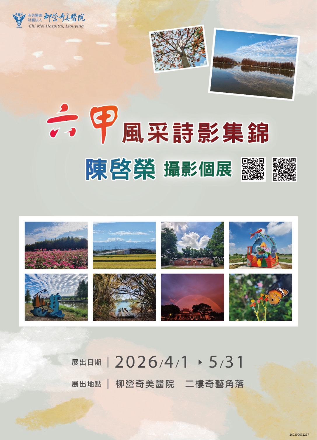 (記者邱秋逢/台南報導)藝術一向具有治療和啟發人生的力量,為消除民眾長期以來對醫院冰冷的刻板印象,柳營奇美醫院二樓「奇藝角落」於4月1日至5月31日推出「六甲風采詩影集錦」展覽,作品由臺南市六甲區陳啓榮區長親自拍攝,精選40幅的手機攝影作品,搭配其創作的優美詩詞,將六甲區獨特的自然美景與人文底蘊,帶進醫療殿堂,讓民眾在就醫之餘,也能感受藝術帶來的療癒與感動。