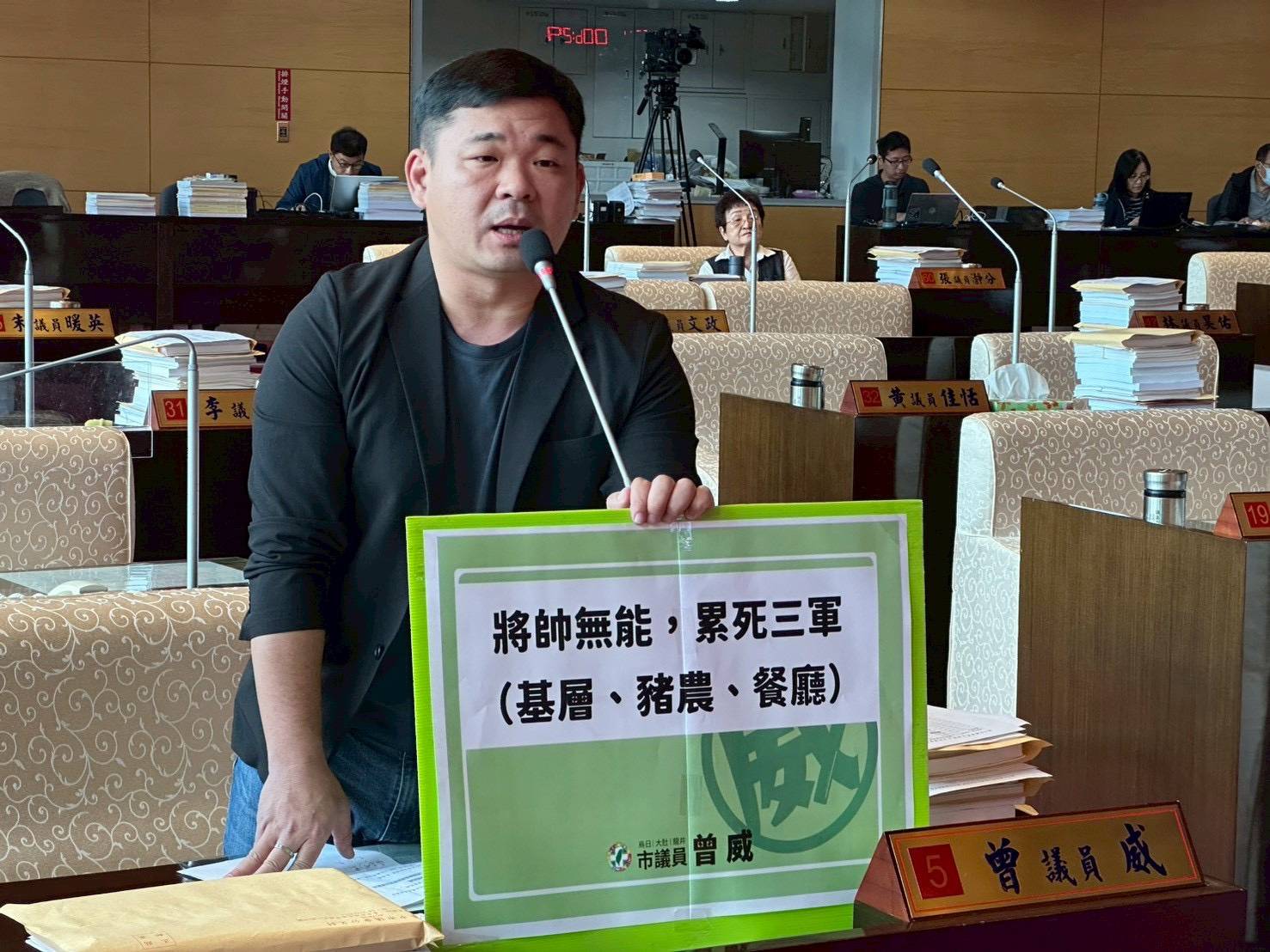 曾威議員指出,台中市環保局是「將帥無能,累死三軍」,環保局的消極態度連累了基層人員、豬農以及餐飲業者,基層人員工作量暴增,忙得焦頭爛額;豬農的豬隻收益受損,還得幫忙市政府處理廚餘;餐飲業者沒有豬肉可用,連營業都有問題。