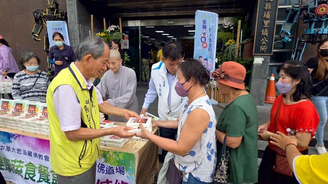 圖1:觀音山中華大悲法藏佛教會-埔里分會免費贈送600份美味蔬食便當,埔里鎮長廖志城親自出席並致贈感謝狀。