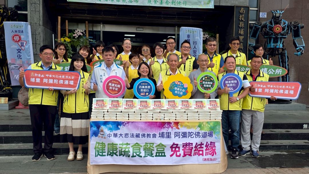 觀音山中華大悲法藏佛教會-埔里分會阿彌陀佛道場洪碧霞副會長表示: 依照經典紀載,今日行善有十億倍功德,所以特別在11月11日與埔里鎮公所共同舉辦「惜福環保感恩心‧蔬食善念利他行」,免費贈送600份美味蔬食便當,邀請埔里鎮公所、埔里鎮民代表會、埔里衛生所、埔里戶政事務所、埔里地政事務所、財政部中區國稅局埔里稽徵所、警察局埔里分局、稅務局等單位以及埔里當地的民眾朋友共同響應蔬食環保救地球。