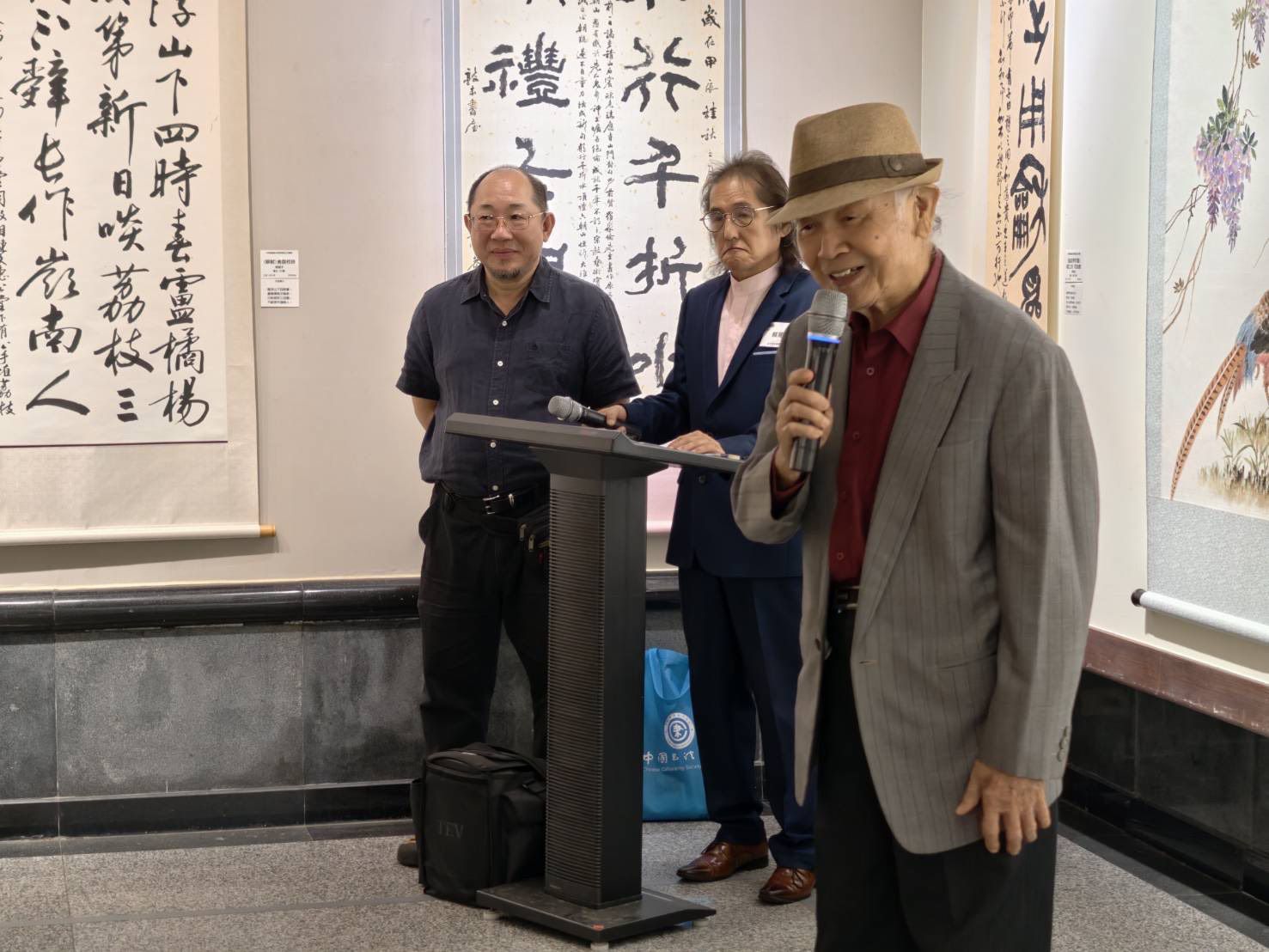 十五日的開幕典禮,司儀由懷古藝術公司總監(即策展人)蔡篤釗、中華鬯爐書法學會秘書長沈致中共同主持,首先由琵琶公子黃俊豪精彩演奏揭開序幕,接著由港區藝術中心秘書周武慶、台灣中國書法學會副理事長張自強、阮威旭、前台中縣文化局長陳志聲等人受邀致詞,稱讚該會對於文化發揚的貢獻;鬯盧書法學會理事長蔡淑惠除了感謝各界的鼎力支持,並表示這是該會首度到港區藝術中心展出,展品都是該會的會員精品值得欣賞,相信到場觀賞的民眾會覺得不虛此行。