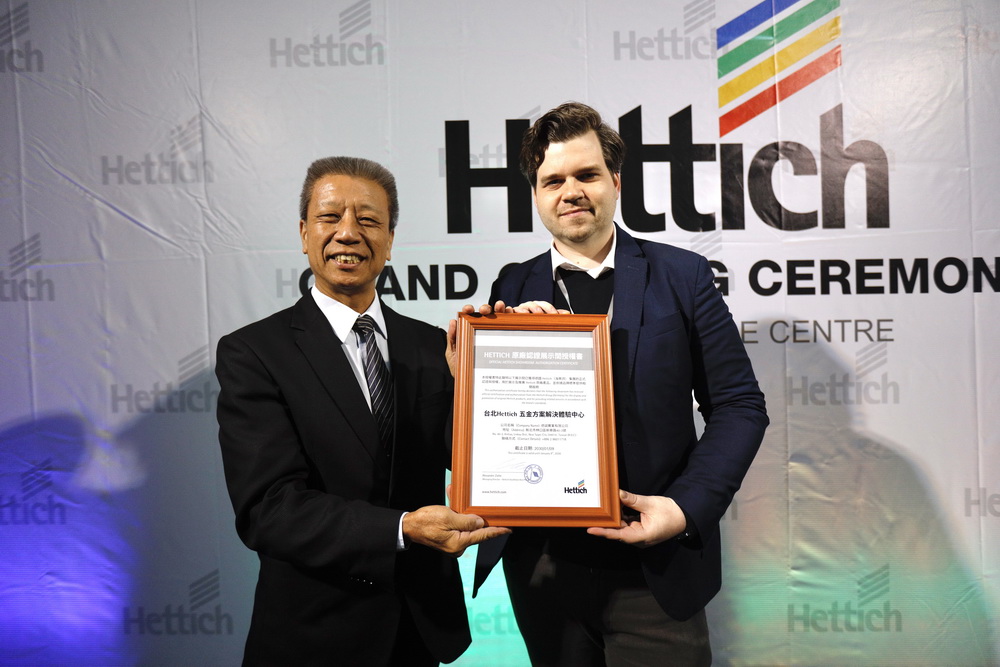 ▲由Hettich亞太區副總裁Alex頒發Hettich授權證書與德誠實業董事長 胡宸華先生。