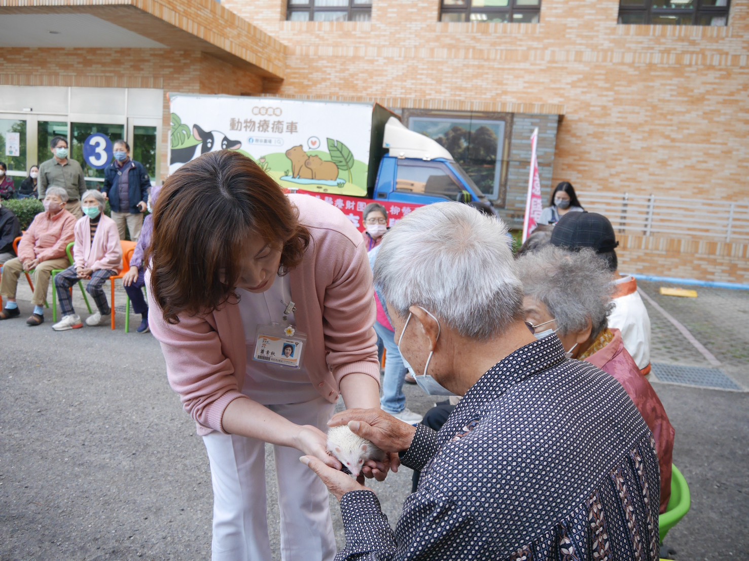活動開始,從樹谷農場的動物療癒車緩緩停下,各種小動物依序出場後,瞬間成為大家的小小療癒師。兔子在草地上蹦跳、刺蝟慢慢探出小腦袋、小羊悠閒咀嚼草料,還有小守宮跟象龜靜靜爬行,宛如迷你動物園。長輩們在工作人員引導下近距離觀察、輕撫、餵食與陪伴,逐漸展露笑容,氣氛溫馨而放鬆。過程中也鼓勵大家主動表達感受並分享過往回憶,一位長輩開心地說著,年輕時在鄉下飼養家畜的生活點滴,笑著與身旁的人分享,讓現場增添更多交流與情感連結。