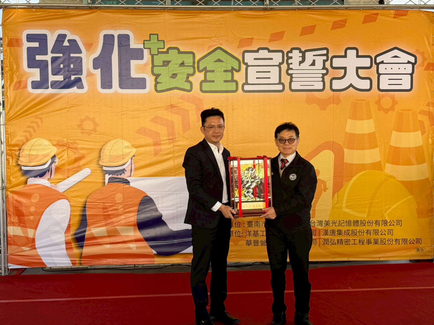 (記者邱秋逢/台南報導)為強化春節前後職場安全監督效能,降低災害發生,南市勞工局今日(1/14) 和經濟部產業園區管理局臺南分局、台灣美光記憶體股份有限公司台南一廠,攜手美光專案相關承攬廠商,於洋基工程美光專案聯合辦公室舉辦「強化安全宣誓大會」,透過跨界合作,促使各承攬廠商強化自主安全管理機制,落實作業前危害辨識、施工環境巡檢、設備檢點及人員安全教育訓練,全面檢視並加強春節前各項安全規範,預防職災發生。