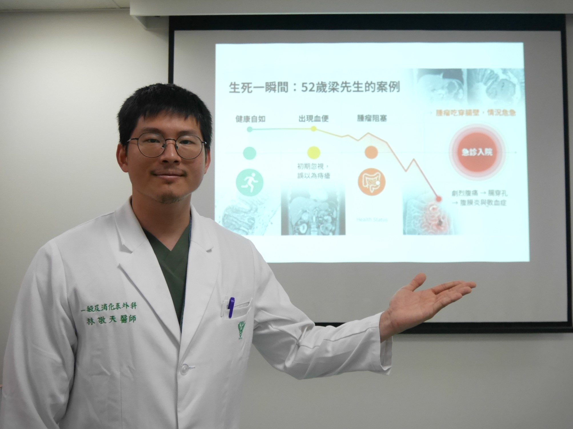 (記者邱秋逢/台南報導)52歲梁先生,平時身體健康行動自如,去年中發現有血便後隨即至診所就診,經糞便潛血檢查呈現陽性反應,便進一步安排大腸鏡檢查,結果發現是大腸腫瘤且造成腸道阻塞,在等候病理切片報告期間突然發生劇烈腹痛,緊急至急診就醫確認是腫瘤造成腸穿孔,醫療團隊及時於黃金時間施予手術完成根除性大腸切除及腸道吻合,並搭配術後加速康復療程(ERAS),梁先生於術後第2天便開始正常飲食且配合手術復健計畫,順利在一周後出院,後續接受一系列的全身性治療及追蹤。