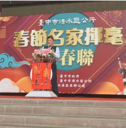 清水區公所的這項「春節名家揮毫贈春聯活動」,於上午在區公所前熱鬧舉辦,開場前先安排歌舞表演助興,區長蔡慶生在致詞時表示,每年舉辦這項活動時都受到地區民眾的高度肯定,因此持續舉辦讓大家都能拿到書法家揮毫的名貴春聯;接著是活動召集人名書法家蔡篤釗表示,今年受邀到場揮毫的書法家是來自新北市、彰化縣、苗栗縣及台中市等各地,分屬各書法協會的名家、老師、教授等,實在是前所未見的名師大集合,要讓地區民眾見識到各名師的揮毫功力。