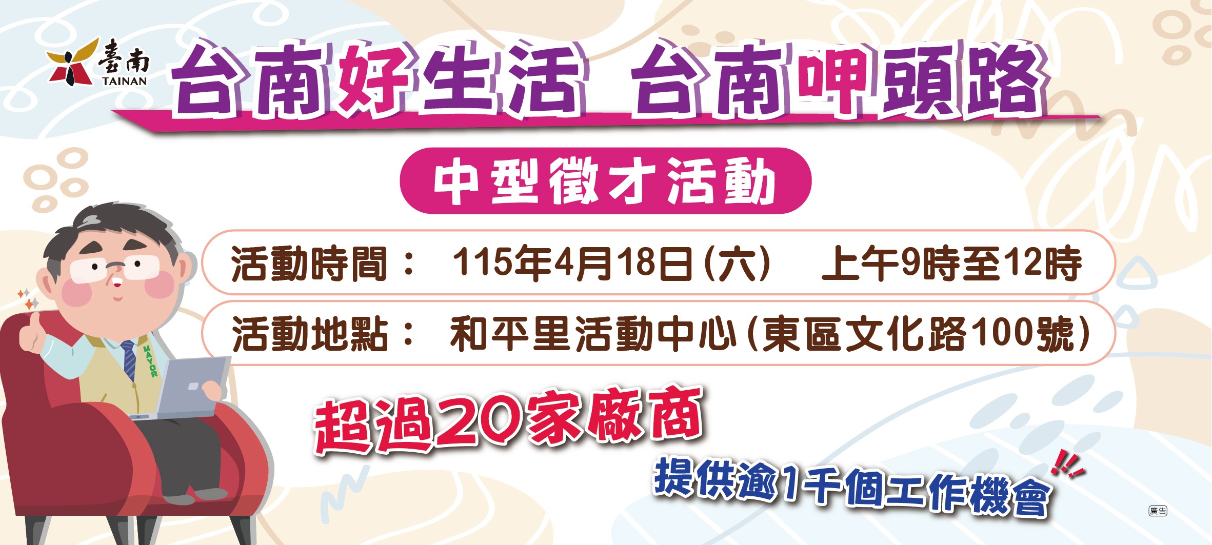 (記者邱秋逢/台南報導)為打造「希望家園」的施政願景,勞工局今(115)年第1場「台南好生活 台南呷頭路」中型徵才活動將於4月18日(週六)上午9時至12時在東區和平里活動中心辦理,有台灣矽科宏晟科技、台灣穗高科技、小北百貨、官田鋼鐵、全家便利商店、臺南紡織、興南汽車客運、統聯汽車客運、台灣東特、東信輕金屬、榮眾科技、全聯實業、璨揚企業等27家廠商,超過1,000個工作機會,鼓勵有求職需求的民眾參加。